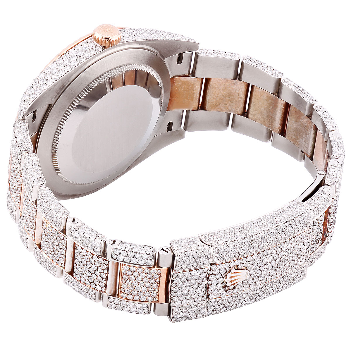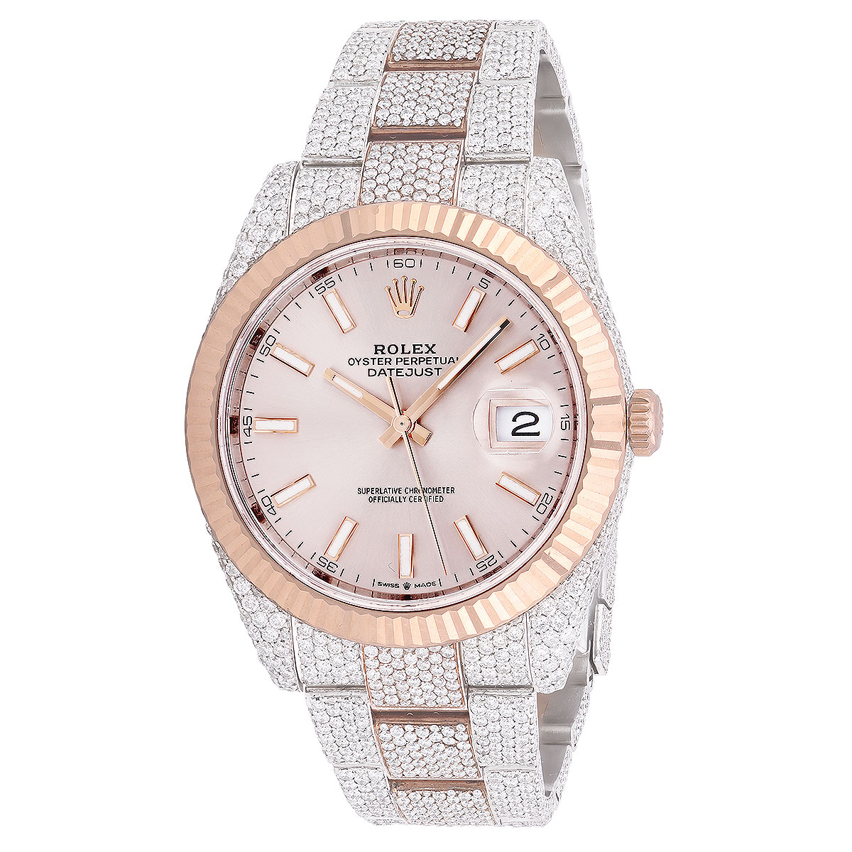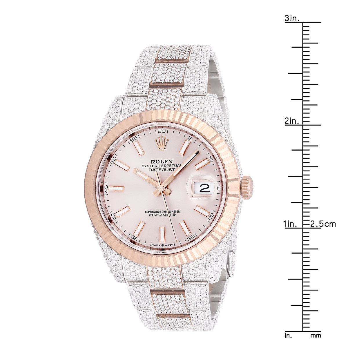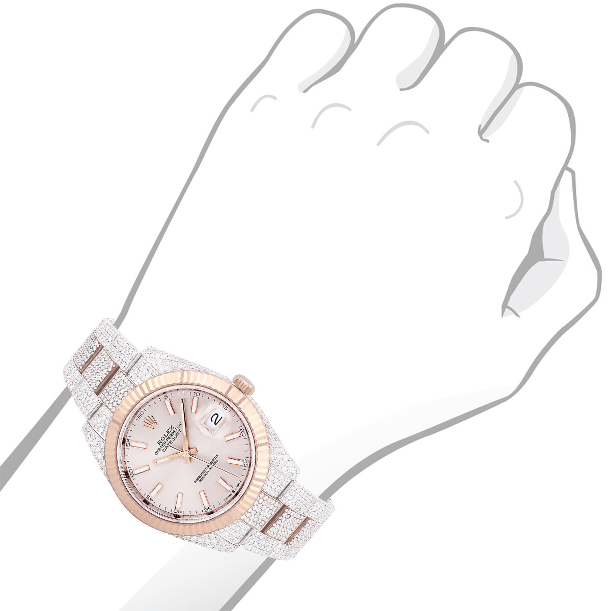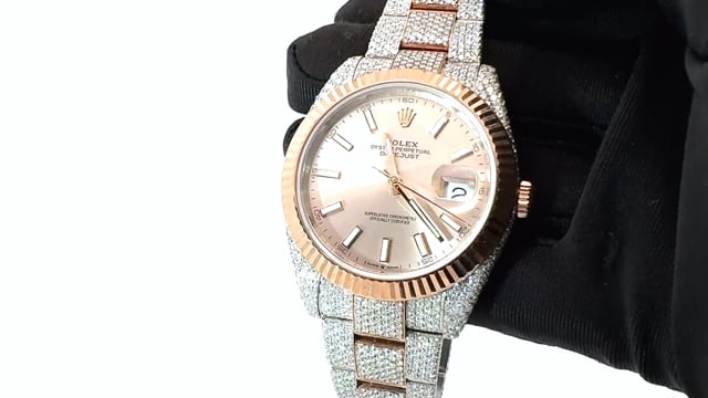This Men's Bust Down Rolex Oyster Perpetual Datejust is a luxurious and stylish watch. It features a White/Rose color scheme, adding sophistication to its design. The watch is made of Gold/Stainless Steel, offering a premium feel. The case measures 41 mm. The case is adorned with White Diamonds, enhancing its elegance. The bracelet is made of Rose Gold and is set with White Diamonds. It features an Oyster style bracelet for a comfortable fit. The bezel is made of Rose Gold. The dial is Rose, enhancing its visual appeal. Powered by an Automatic movement, the watch includes functions such as Date Indicator. Offered in Very Good condition, and comes with a seller's warranty of 60 months. Also available on custom order with additional options. These pre-owned Rolex watches are authentic Rolex watches with genuine diamonds, in excellent condition, they are checked for authenticity and basic water resistance. Watches will withstand an occasional rain just fine, but they are not diver's watches and should not be worn in shower or while swimming.