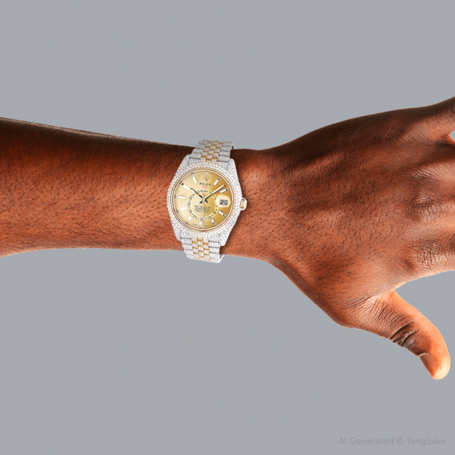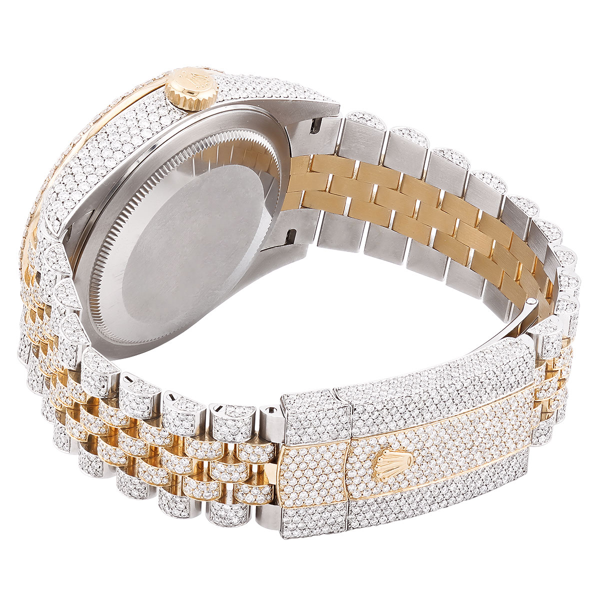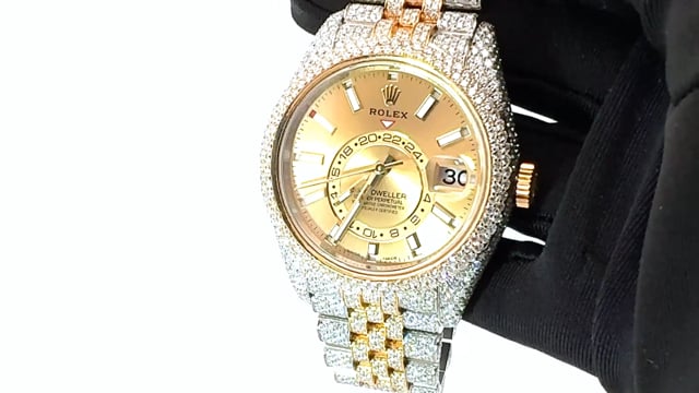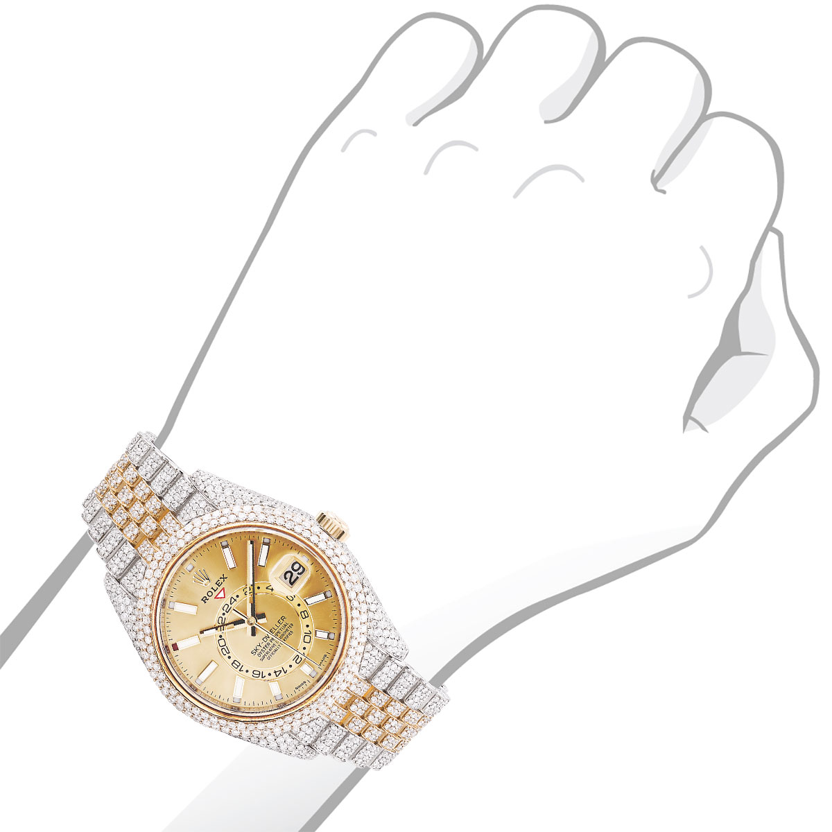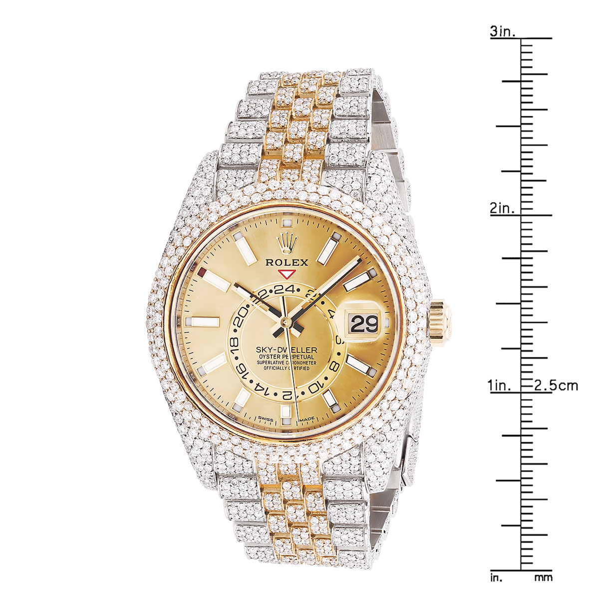 This Men's Bust Down Rolex Sky-Dweller is a luxurious and stylish watch. It features a White/Yellow color scheme, adding sophistication to its design. The watch is made of Gold/Stainless Steel, offering a premium feel. The case measures 41 mm. The case is adorned with White Diamonds, enhancing its elegance. The bracelet is made of Yellow Gold and is set with White Diamonds. It features a Jubilee style bracelet for a comfortable fit. The bezel is made of Yellow Gold and is set with White Diamonds. The dial is Gold Tone, enhancing its visual appeal. Powered by an Automatic movement, the watch includes functions such as Date Indicator. Offered in Very Good condition, and comes with a seller's warranty of 60 months. Also available on custom order with additional options. These pre-owned Rolex watches are authentic Rolex watches with genuine diamonds, in excellent condition, they are checked for authenticity and basic water resistance. Watches will withstand an occasional rain just fine, but they are not diver's watches and should not be worn in shower or while swimming.