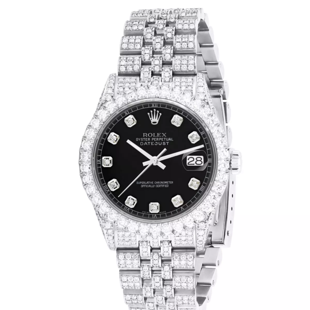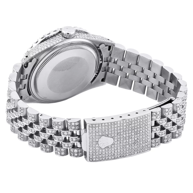 This Men's Bust Down Rolex Datejust is a luxurious and stylish watch. It features a White color scheme, adding sophistication to its design. The watch is made of Stainless Steel, offering a premium feel. The case measures 36 mm. The case is adorned with White s, enhancing its elegance. The bracelet is made of White Stainless Steel and is set with White. It features a Jubilee style bracelet for a comfortable fit. The bezel is made of White Stainless Steel and is set with White Diamonds. The dial is Black, enhancing its visual appeal. Powered by an Automatic movement, the watch includes functions such as Date Indicator. Offered in Very Good condition, and comes with a seller's warranty of 60 months. Also available on custom order with additional options. These pre-owned Rolex watches are authentic Rolex watches with genuine diamonds, in excellent condition, they are checked for authenticity and basic water resistance. Watches will withstand an occasional rain just fine, but they are not diver's watches and should not be worn in shower or while swimming.