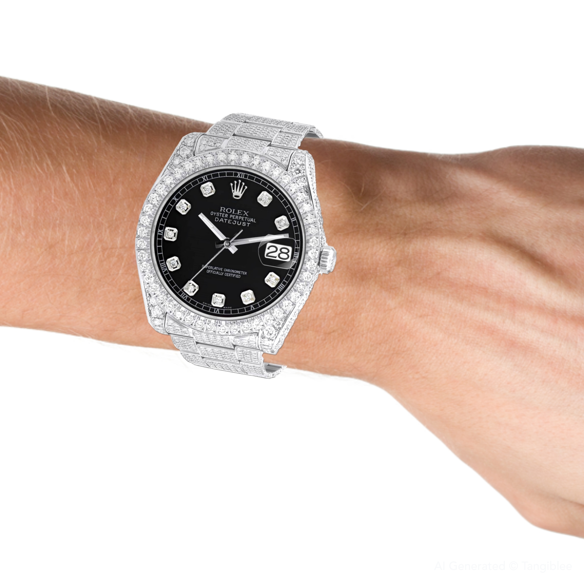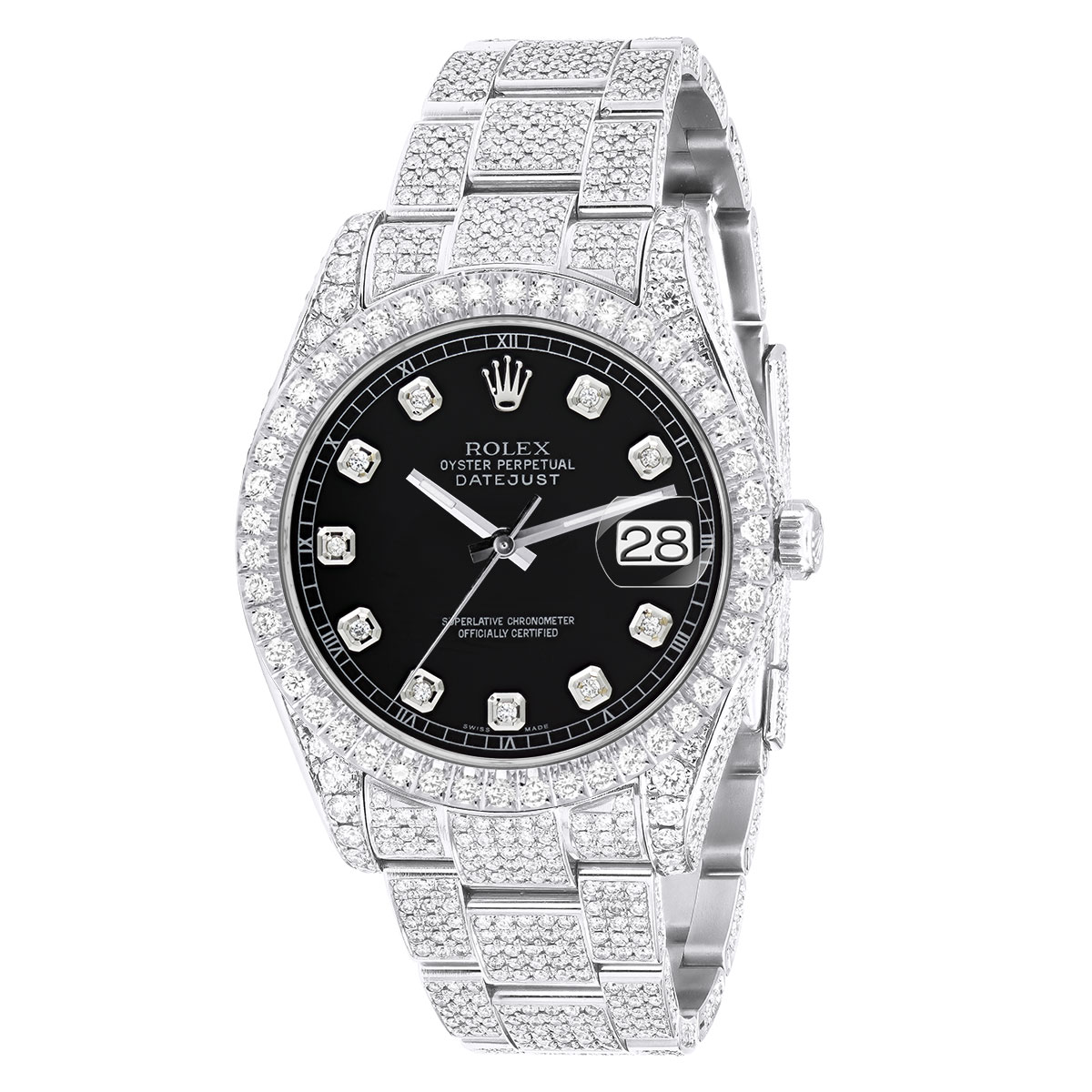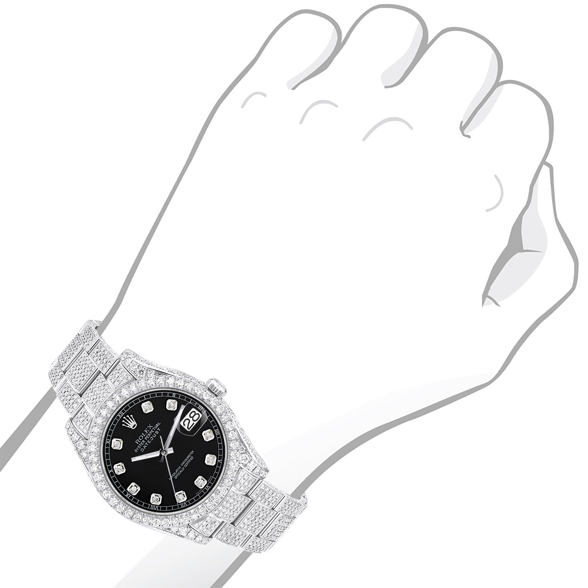 This Men's Bust Down Rolex Datejust is a luxurious and stylish watch. It features a White color scheme, adding sophistication to its design. The watch is made of Stainless Steel, offering a premium feel. The case measures 41 mm. The bracelet is made of White Stainless Steel It features an Oyster style bracelet for a comfortable fit. The bezel is made of White Stainless Steel and is set with White Diamonds. The dial is Black, enhancing its visual appeal. Powered by an Automatic movement, the watch includes functions such as Date Indicator. Offered in Very Good condition, and comes with a seller's warranty of 60 months. Also available on custom order with additional options. These pre-owned Rolex watches are authentic Rolex watches with genuine diamonds, in excellent condition, they are checked for authenticity and basic water resistance. Watches will withstand an occasional rain just fine, but they are not diver's watches and should not be worn in shower or while swimming.