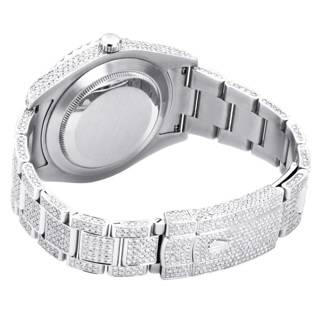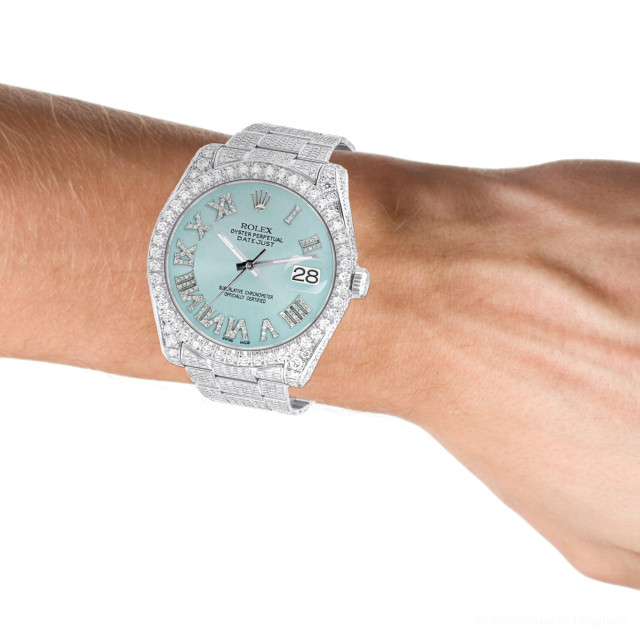 This Men's Bust Down Rolex Datejust is a luxurious and stylish watch. It features a White color scheme, adding sophistication to its design. The watch is made of Stainless Steel, offering a premium feel. The case measures 41 mm. The bracelet is made of White Stainless Steel It features an Oyster style bracelet for a comfortable fit. The bezel is made of White Stainless Steel and is set with White Diamonds. The dial is Light Blue, enhancing its visual appeal. Powered by an Automatic movement, the watch includes functions such as Date Indicator. Offered in Very Good condition, and comes with a seller's warranty of 60 months. Also available on custom order with additional options. These pre-owned Rolex watches are authentic Rolex watches with genuine diamonds, in excellent condition, they are checked for authenticity and basic water resistance. Watches will withstand an occasional rain just fine, but they are not diver's watches and should not be worn in shower or while swimming.