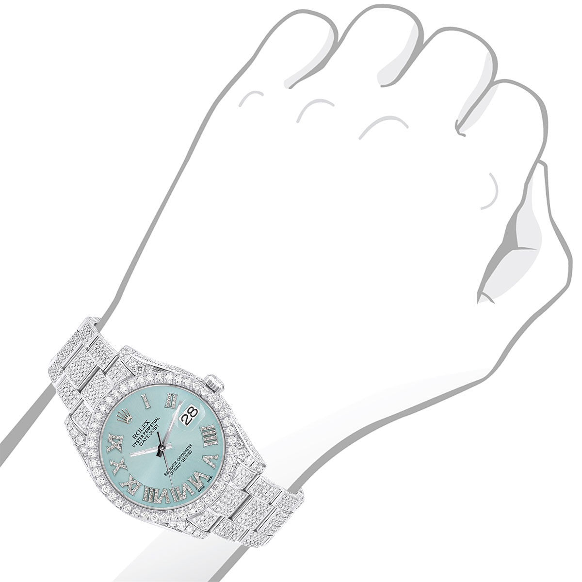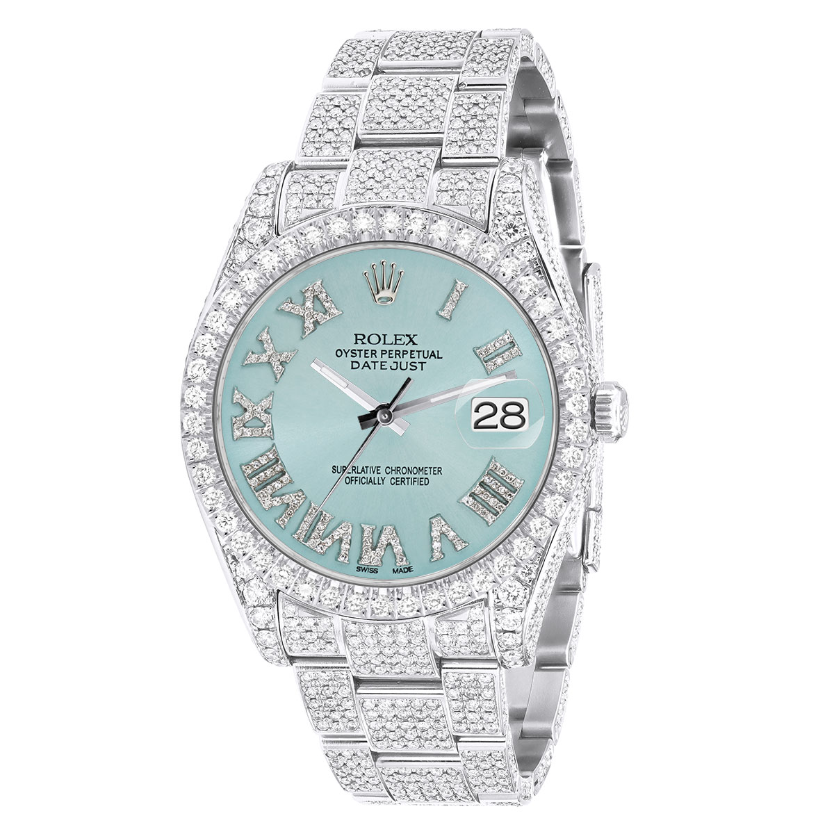 Men's Stainless Steel Bust Down Diamond Watch | Rolex Datejust 41 mm | Roman Numerals | Light Blue Dial