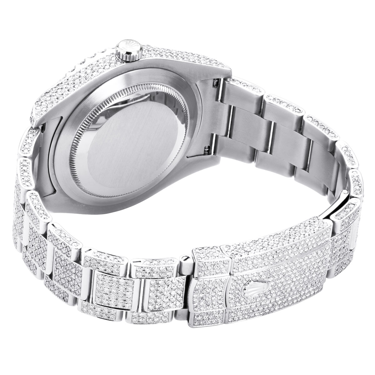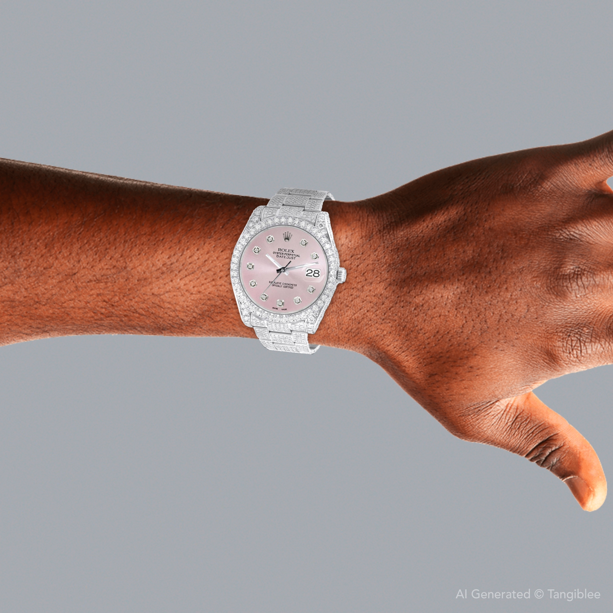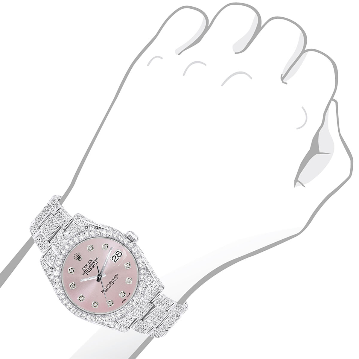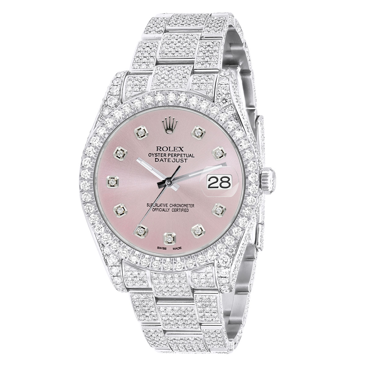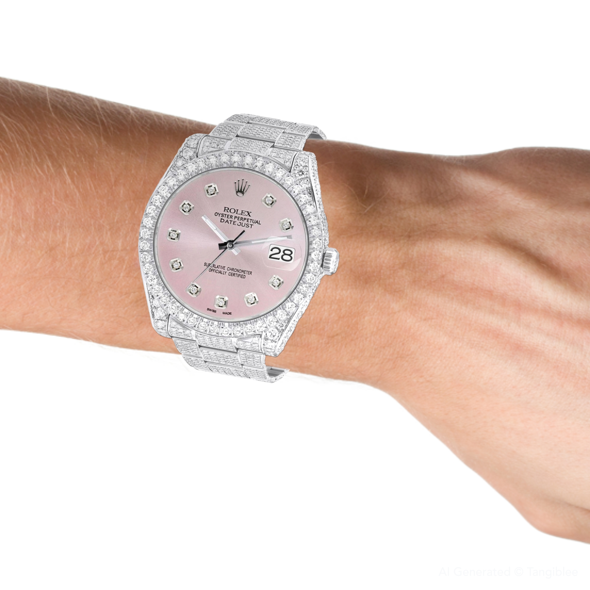 This Men's Bust Down Rolex Datejust is a luxurious and stylish watch. It features a White color scheme, adding sophistication to its design. The watch is made of Stainless Steel, offering a premium feel. The case measures 41 mm. The bracelet is made of White Stainless Steel It features an Oyster style bracelet for a comfortable fit. The bezel is made of White Stainless Steel and is set with White Diamonds. The dial is Rose, enhancing its visual appeal. Powered by an Automatic movement, the watch includes functions such as Date Indicator. Offered in Very Good condition, and comes with a seller's warranty of 60 months. Also available on custom order with additional options. These pre-owned Rolex watches are authentic Rolex watches with genuine diamonds, in excellent condition, they are checked for authenticity and basic water resistance. Watches will withstand an occasional rain just fine, but they are not diver's watches and should not be worn in shower or while swimming.