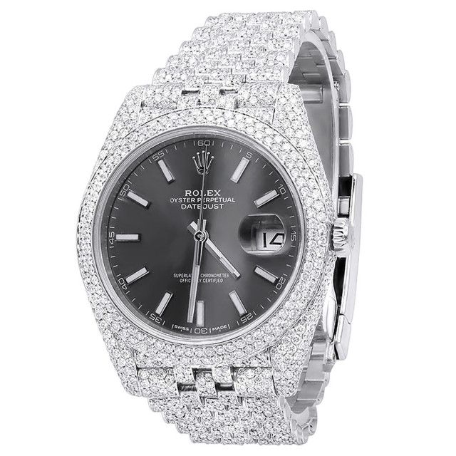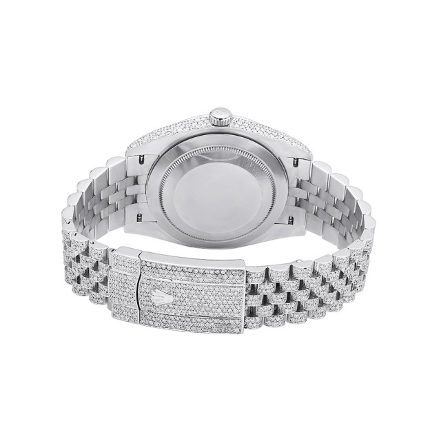 This Men's Bust Down Rolex Datejust is a luxurious and stylish watch. The watch is made of Stainless Steel, offering a premium feel. The case measures 41 mm. The case is adorned with White s, enhancing its elegance. The bracelet is made of White Stainless Steel and is set with White. It features an Oyster style bracelet for a comfortable fit. The bezel is made of White Stainless Steel and is set with White Diamonds. The dial is Black, enhancing its visual appeal and comes with a seller's warranty of 60 months. Also available on custom order with additional options. These pre-owned Rolex watches are authentic Rolex watches with genuine diamonds, in excellent condition, they are checked for authenticity and basic water resistance. Watches will withstand an occasional rain just fine, but they are not diver's watches and should not be worn in shower or while swimming.