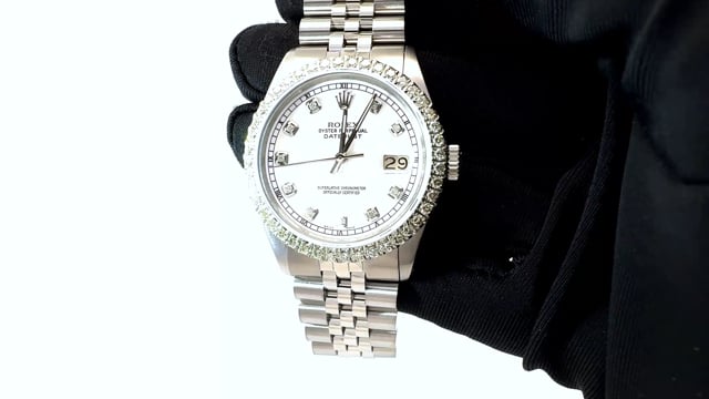 This Men's Rolex Datejust is a luxurious and stylish watch. The watch is made of Stainless Steel, offering a premium feel. The case measures 36 mm. The bracelet is made of Stainless Steel It features a Jubilee style bracelet for a comfortable fit. The bezel is made of Stainless Steel and is set with White Diamonds. The dial is White, enhancing its visual appeal. Powered by an Automatic movement. Offered in Good condition, and comes with a seller's warranty of 60 months. Also available on custom order with additional options. These pre-owned Rolex watches are authentic Rolex watches with genuine diamonds, in excellent condition, they are checked for authenticity and basic water resistance. Watches will withstand an occasional rain just fine, but they are not diver's watches and should not be worn in shower or while swimming.