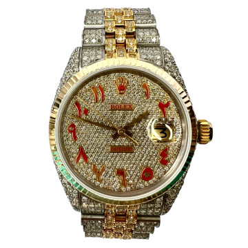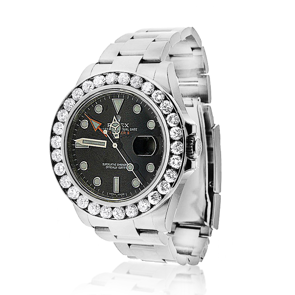 This Men's Casual Rolex Explorer is a luxurious and stylish watch. It features a White color scheme, adding sophistication to its design. The watch is made of Stainless Steel, offering a premium feel. The case measures 40 mm. The bracelet is made of Stainless Steel It features an Oyster style bracelet for a comfortable fit. The bezel is made of Stainless Steel and is set with White Diamonds. The dial is Black, enhancing its visual appeal the watch includes functions such as Date Indicator. Offered in Very Good condition, and comes with a seller's warranty of 60 months. Also available on custom order with additional options. These pre-owned Rolex watches are authentic Rolex watches with genuine diamonds, in excellent condition, they are checked for authenticity and basic water resistance. Watches will withstand an occasional rain just fine, but they are not diver's watches and should not be worn in shower or while swimming.