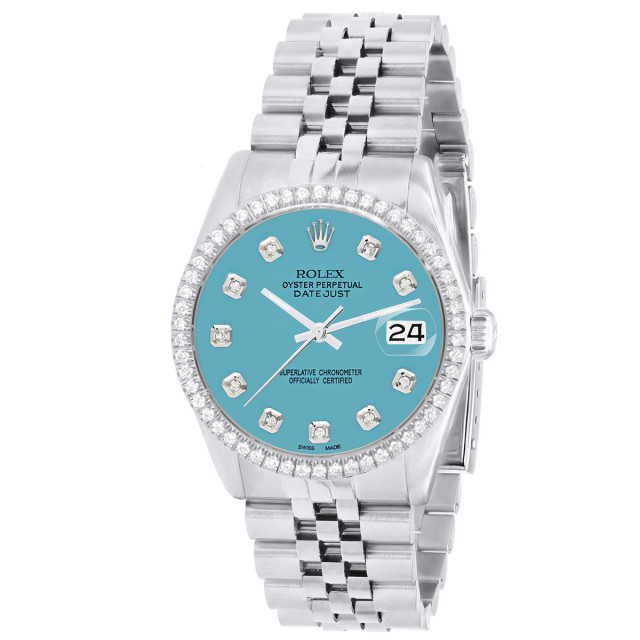 This Men's Rolex Oyster Perpetual Datejust is a luxurious and stylish watch. It features a White color scheme, adding sophistication to its design. The watch is made of Stainless Steel, offering a premium feel. The case measures 36 mm. The bracelet is made of White Stainless Steel It features a Jubilee style bracelet for a comfortable fit. The bezel is made of White Stainless Steel and is set with White Diamonds. The dial is Blue, enhancing its visual appeal. Powered by an Automatic movement, the watch includes functions such as Date Indicator. Offered in Good condition, and comes with a seller's warranty of 60 months. Also available on custom order with additional options. These pre-owned Rolex watches are authentic Rolex watches with genuine diamonds, in excellent condition, they are checked for authenticity and basic water resistance. Watches will withstand an occasional rain just fine, but they are not diver's watches and should not be worn in shower or while swimming.