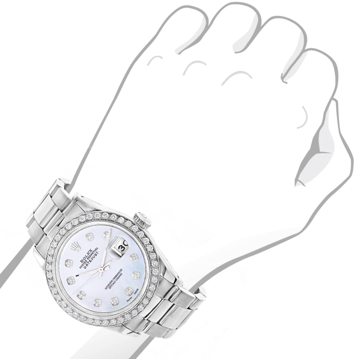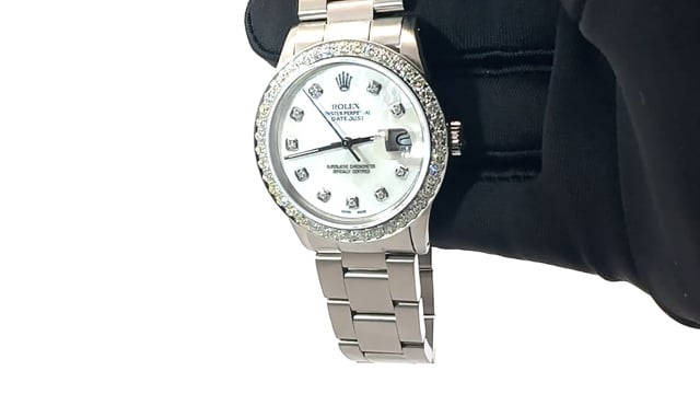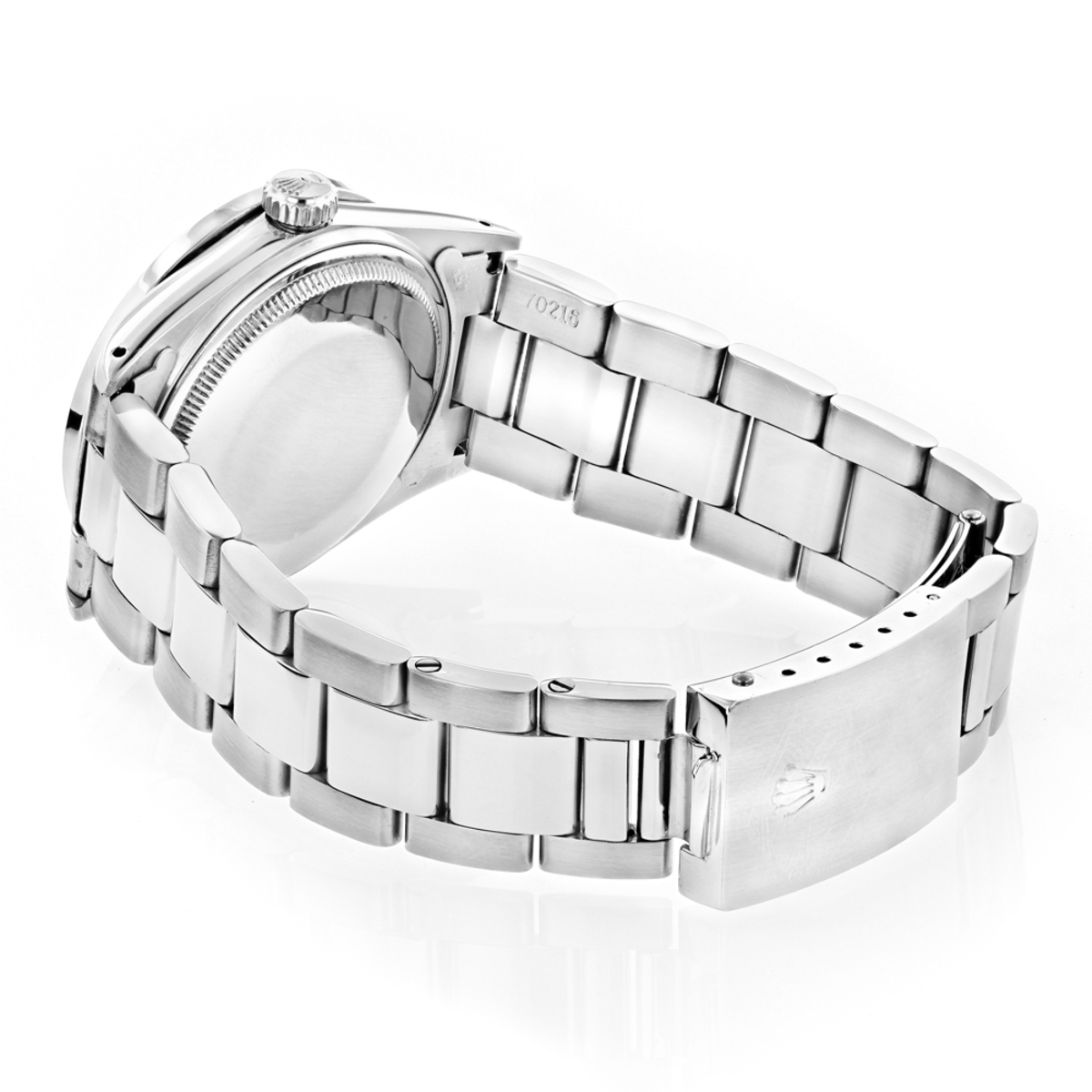 This Men's Business Rolex Oyster Perpetual Datejust is a luxurious and stylish watch. The watch is made of Stainless Steel, offering a premium feel. The case measures 36 mm. The bracelet is made of Stainless Steel It features an Oyster style bracelet for a comfortable fit. The bezel is made of Stainless Steel and is set with White Diamonds. The dial is White, enhancing its visual appeal the watch includes functions such as Date Indicator. Offered in Very Good condition, and comes with a seller's warranty of 60 months. Also available on custom order with additional options. These pre-owned Rolex watches are authentic Rolex watches with genuine diamonds, in excellent condition, they are checked for authenticity and basic water resistance. Watches will withstand an occasional rain just fine, but they are not diver's watches and should not be worn in shower or while swimming.