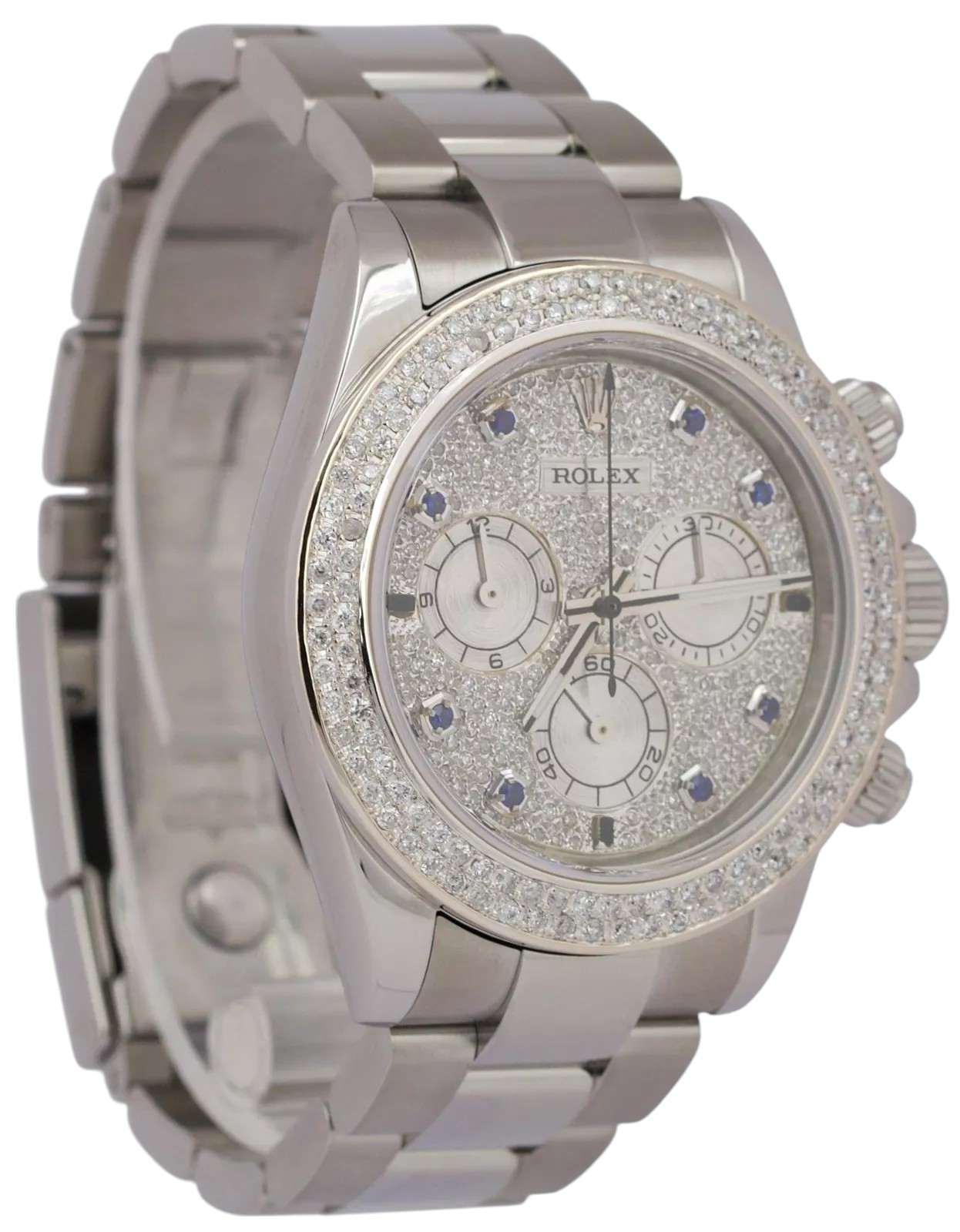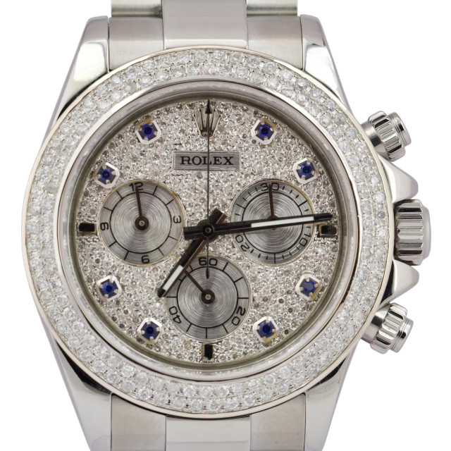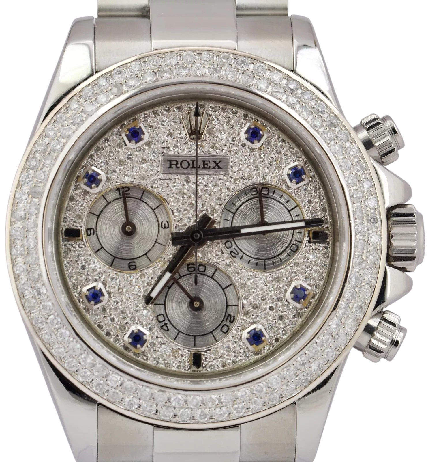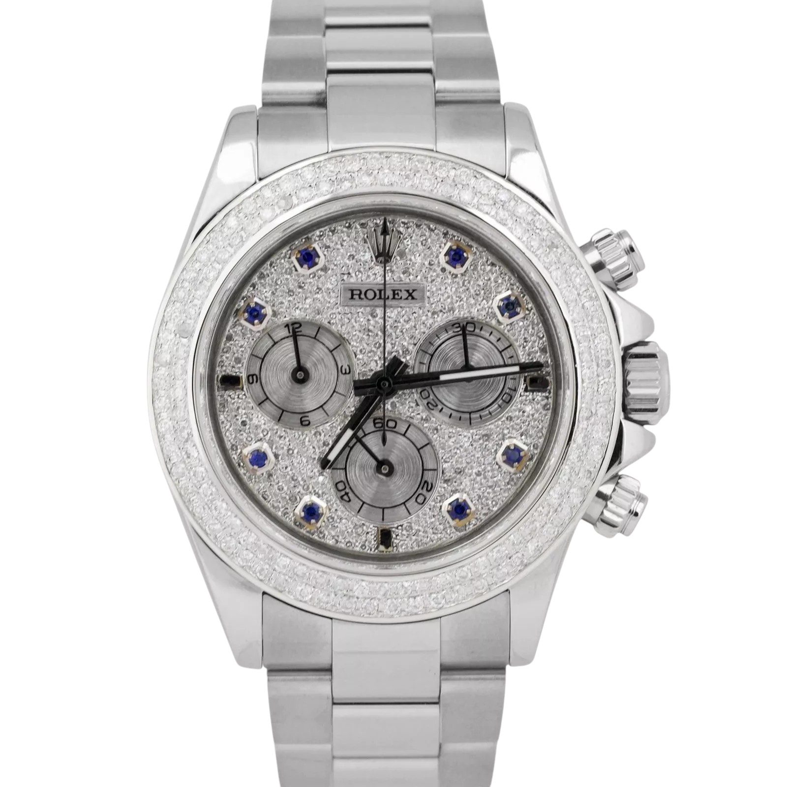 This Men's Two-Tone Rolex Cosmograph Daytona is a luxurious and stylish watch. The watch is made of Stainless Steel, offering a premium feel. The case measures 40 mm. The bracelet is made of White Stainless Steel It features an Oyster style bracelet for a comfortable fit. The bezel is made of White Gold and is set with White Diamonds. The dial is White, enhancing its visual appeal. Offered in Good condition, and comes with a seller's warranty of 60 months. Also available on custom order with additional options. These pre-owned Rolex watches are authentic Rolex watches with genuine diamonds, in excellent condition, they are checked for authenticity and basic water resistance. Watches will withstand an occasional rain just fine, but they are not diver's watches and should not be worn in shower or while swimming.