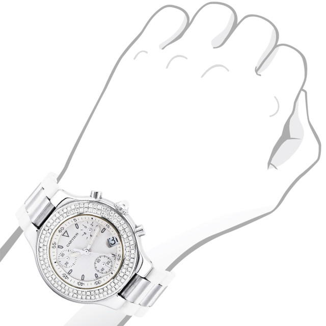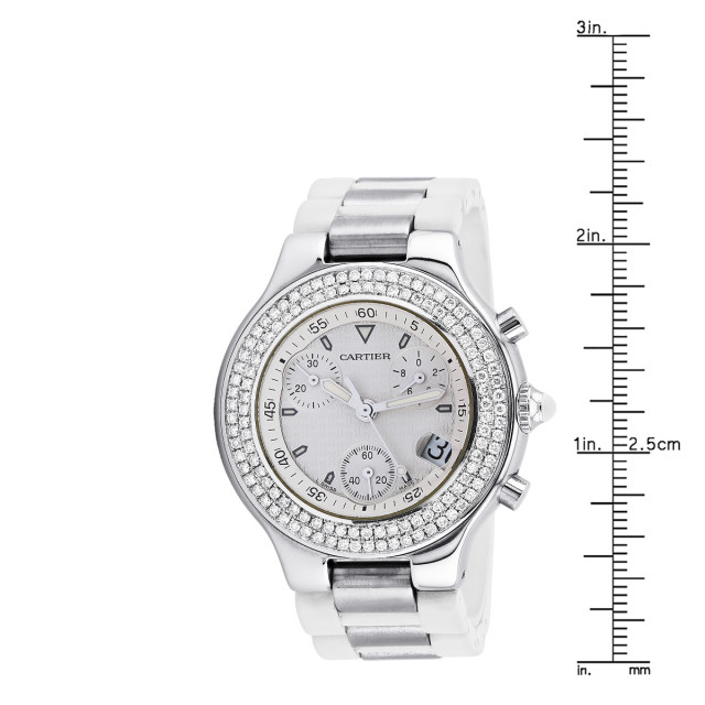 This Men's Cartier Chronoscaph 21 is a luxurious and stylish watch. The watch is made of Stainless Steel, offering a premium feel. The case measures 38 mm. The bracelet is made of White Rubber. The bezel is made of Stainless Steel and is set with White. The dial is Cream, enhancing its visual appeal. Powered by a Quartz movement, the watch includes functions such as Chronograph. Offered in Good condition, and comes with a seller's warranty of 60 months. Also available on custom order with additional options.