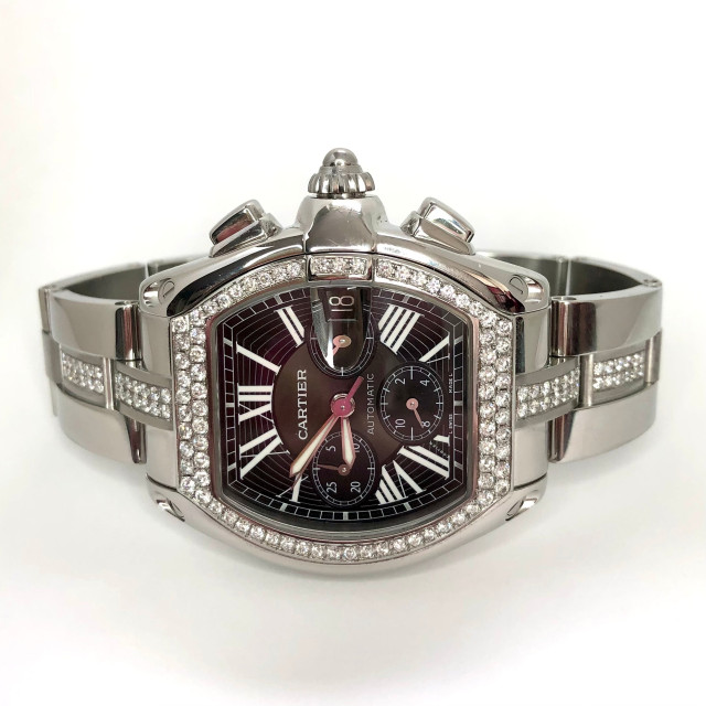 This Men's Cartier Roadster is a luxurious and stylish watch. The watch is made of Stainless Steel, offering a premium feel. The case measures 42 mm. The bracelet is made of Stainless Steel. The bezel is made of Stainless Steel and is set with White. The dial is Black, enhancing its visual appeal. Powered by an Automatic movement, the watch includes functions such as Chronograph. Offered in Good condition, and comes with a seller's warranty of 60 months. Also available on custom order with additional options.