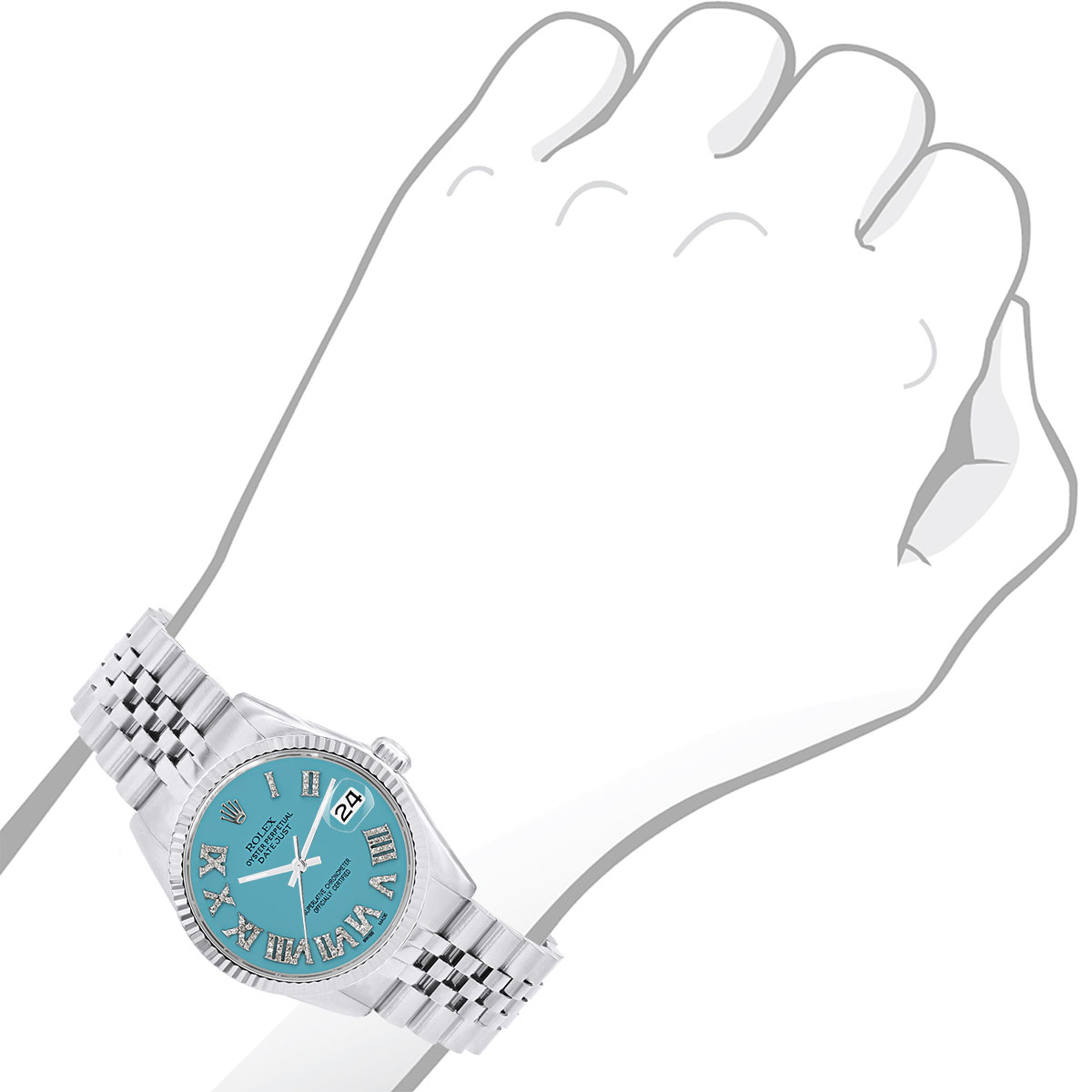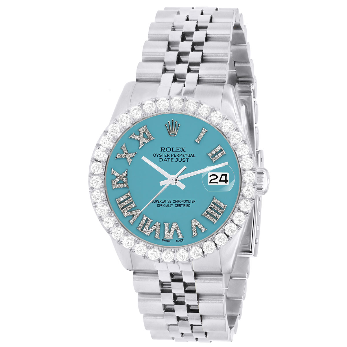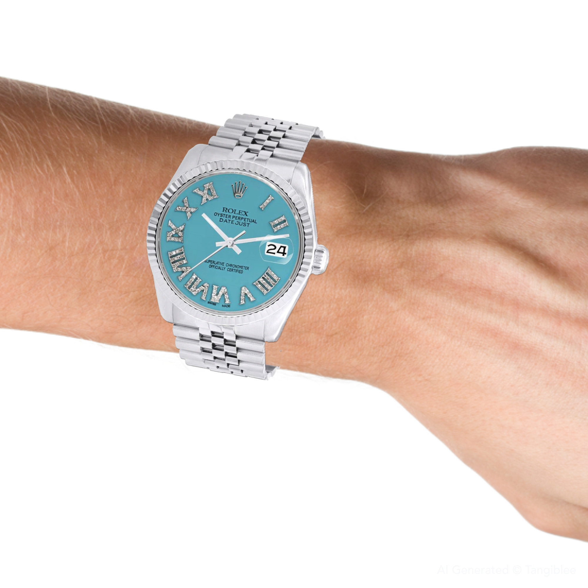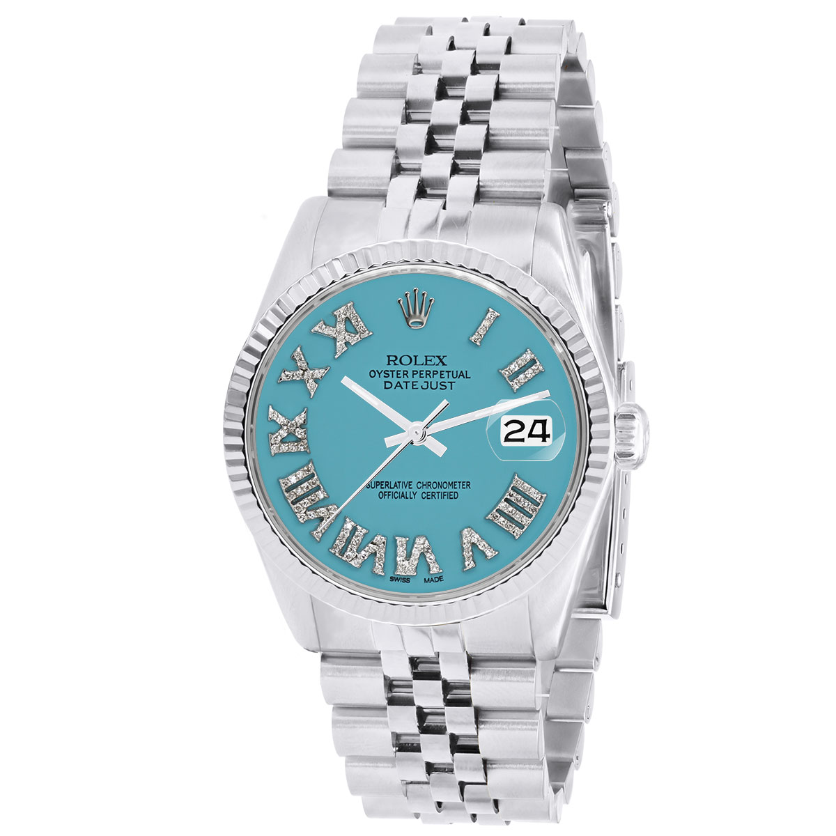 This Men's Rolex Datejust is a luxurious and stylish watch. It features a White color scheme, adding sophistication to its design. The watch is made of Stainless Steel, offering a premium feel. The case measures 36 mm. The bracelet is made of White Stainless Steel It features a Jubilee style bracelet for a comfortable fit. The bezel is made of White Stainless Steel. The dial is Turquoise, enhancing its visual appeal. Powered by an Automatic movement, the watch includes functions such as Date Indicator. Offered in Very Good condition, and comes with a seller's warranty of 60 months. Also available on custom order with additional options. These pre-owned Rolex watches are authentic Rolex watches with genuine diamonds, in excellent condition, they are checked for authenticity and basic water resistance. Watches will withstand an occasional rain just fine, but they are not diver's watches and should not be worn in shower or while swimming.