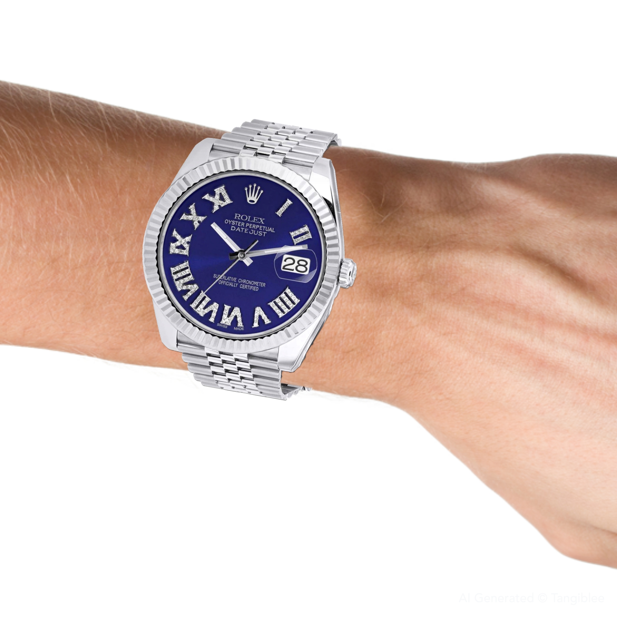 This Men's Rolex Datejust is a luxurious and stylish watch. It features a White color scheme, adding sophistication to its design. The watch is made of Stainless Steel, offering a premium feel. The case measures 41 mm. The bracelet is made of White Stainless Steel It features a Jubilee style bracelet for a comfortable fit. The bezel is made of White Stainless Steel. The dial is Dark Blue, enhancing its visual appeal. Powered by an Automatic movement, the watch includes functions such as Date Indicator. Offered in Very Good condition, and comes with a seller's warranty of 60 months. Also available on custom order with additional options. These pre-owned Rolex watches are authentic Rolex watches with genuine diamonds, in excellent condition, they are checked for authenticity and basic water resistance. Watches will withstand an occasional rain just fine, but they are not diver's watches and should not be worn in shower or while swimming.
