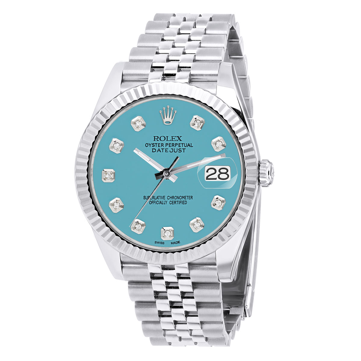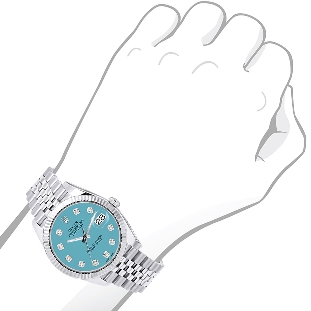 This Men's Rolex Datejust is a luxurious and stylish watch. It features a White color scheme, adding sophistication to its design. The watch is made of Stainless Steel, offering a premium feel. The case measures 41 mm. The bracelet is made of White Stainless Steel It features a Jubilee style bracelet for a comfortable fit. The bezel is made of White Stainless Steel. The dial is Turquoise, enhancing its visual appeal. Powered by an Automatic movement, the watch includes functions such as Date Indicator. Offered in Very Good condition, and comes with a seller's warranty of 60 months. Also available on custom order with additional options. These pre-owned Rolex watches are authentic Rolex watches with genuine diamonds, in excellent condition, they are checked for authenticity and basic water resistance. Watches will withstand an occasional rain just fine, but they are not diver's watches and should not be worn in shower or while swimming.