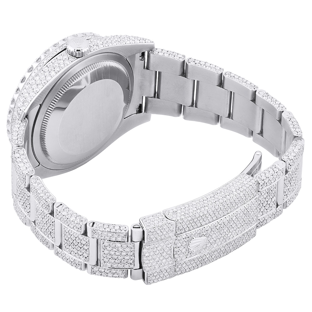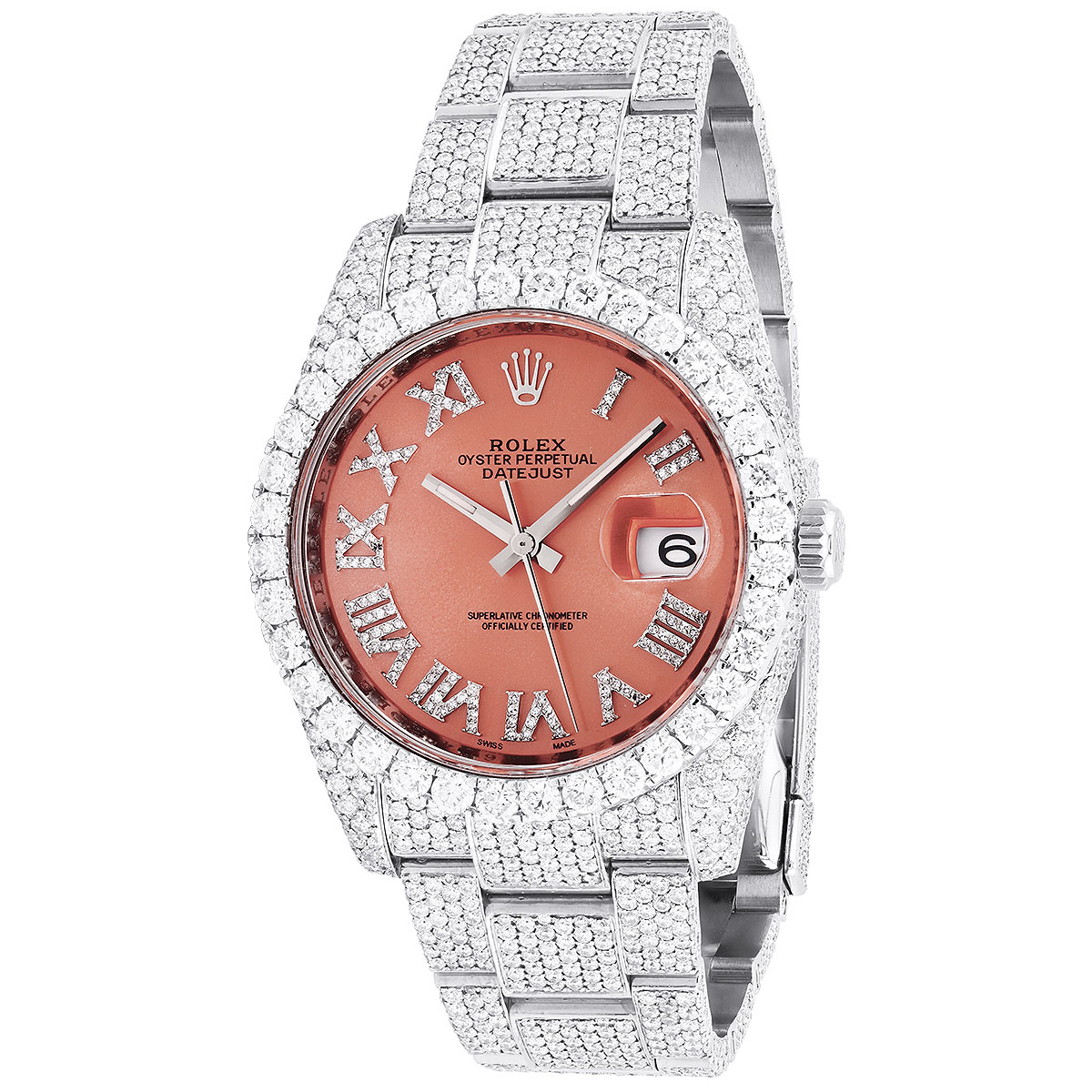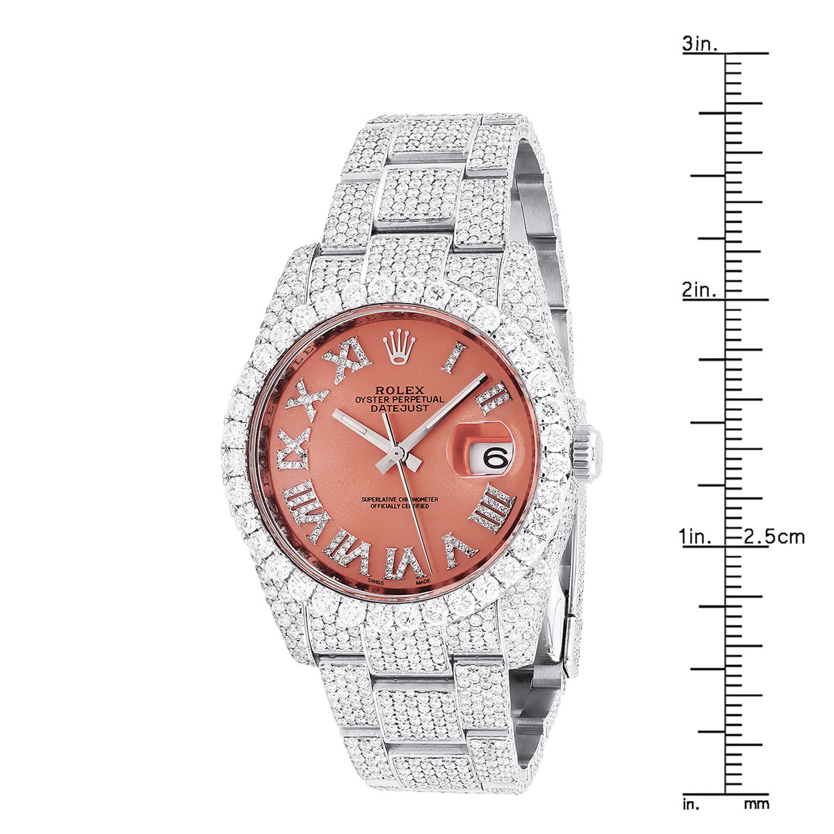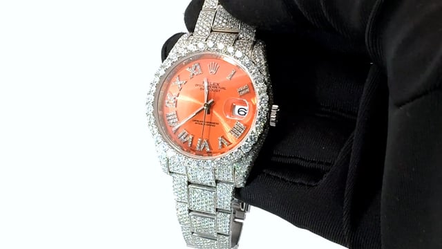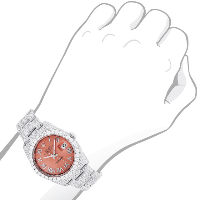 This Men's Bust Down Rolex Oyster Perpetual Datejust is a luxurious and stylish watch. It features a White color scheme, adding sophistication to its design. The watch is made of Stainless Steel, offering a premium feel. The case measures 36 mm. The case is adorned with White Diamonds, enhancing its elegance. The bracelet is made of White Stainless Steel and is set with White Diamonds. It features an Oyster style bracelet for a comfortable fit. The bezel is made of White Stainless Steel and is set with White Diamonds. The dial is Red, enhancing its visual appeal. Powered by an Automatic movement, the watch includes functions such as Date Indicator. Offered in Very Good condition, and comes with a seller's warranty of 60 months. Also available on custom order with additional options. These pre-owned Rolex watches are authentic Rolex watches with genuine diamonds, in excellent condition, they are checked for authenticity and basic water resistance. Watches will withstand an occasional rain just fine, but they are not diver's watches and should not be worn in shower or while swimming.