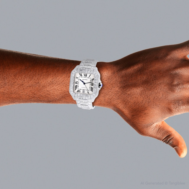 This Men's and Women's Bust Down Cartier Santos de Cartier is a luxurious and stylish watch. It features a White color scheme, adding sophistication to its design. The watch is made of Stainless Steel, offering a premium feel. The case measures 40 mm. The case is adorned with White Diamonds, enhancing its elegance. The bracelet is made of White Stainless Steel and is set with White Diamonds. The bezel is made of White Stainless Steel and is set with White Diamonds. The dial is White, enhancing its visual appeal. Powered by an Automatic movement, the watch includes functions such as Date Indicator. Offered in Very Good condition, and comes with a seller's warranty of 60 months. Also available on custom order with additional options. Please note this Cartier watch is pre-owned, in excellent condition, the diamonds are high quality, natural diamonds, set by our master craftsmen, watch box might show signs of wear (watch itself will be in perfect condition), comes with a 5 year warranty from ItsHot.