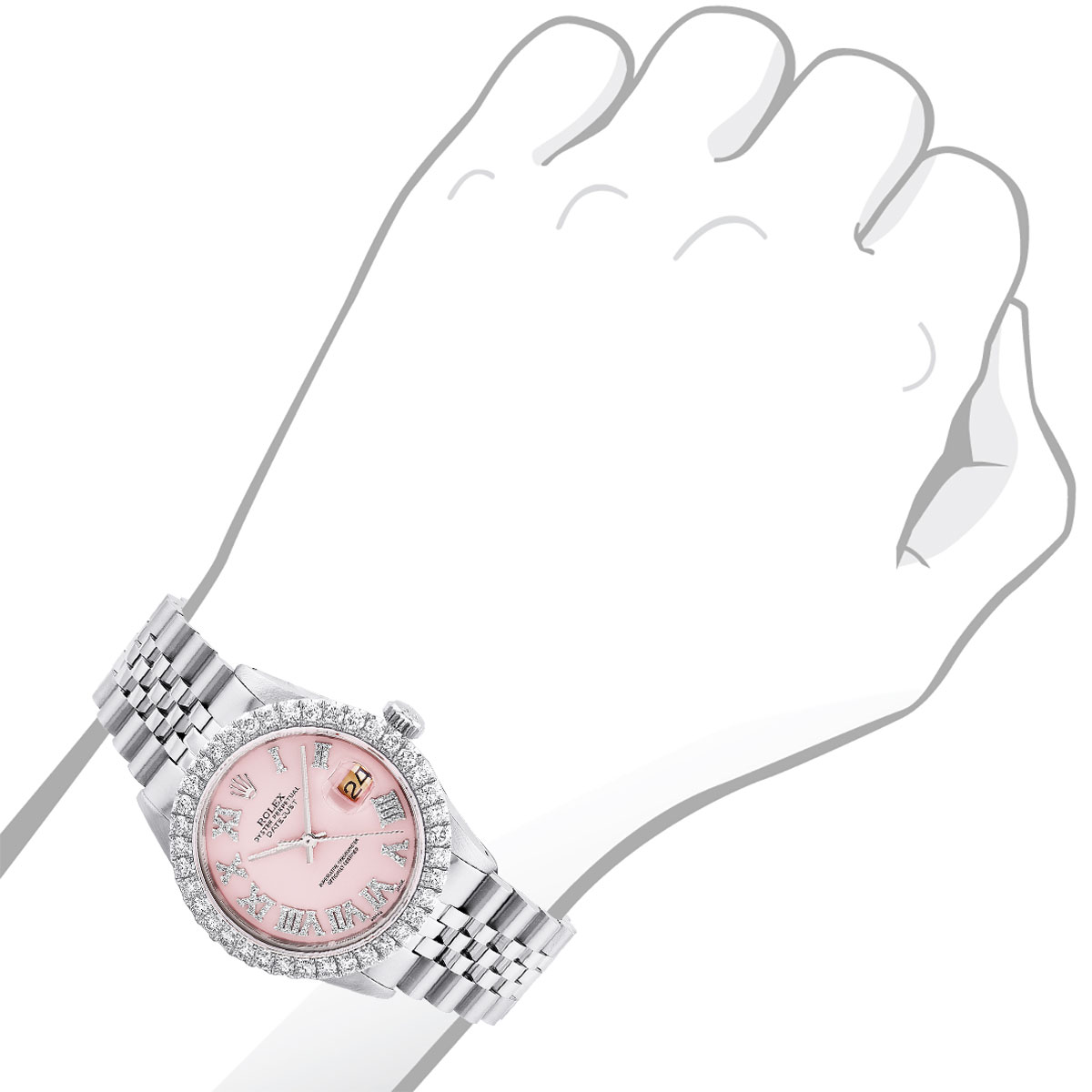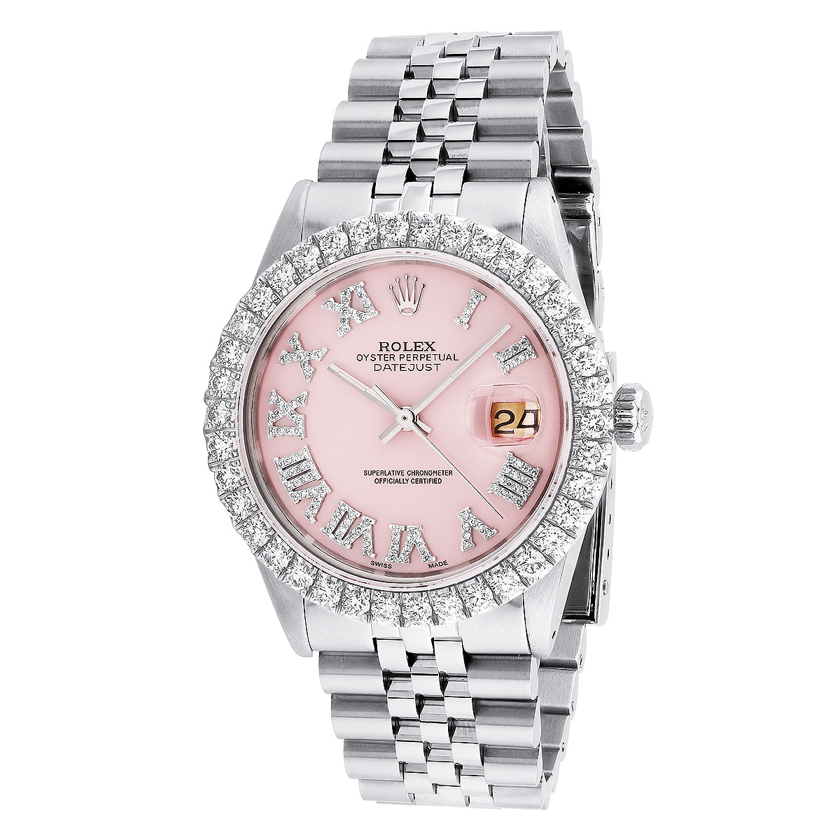 This Men's and Women's Rolex Datejust is a luxurious and stylish watch. The watch is made of Stainless Steel, offering a premium feel. The case measures 36 mm. The bracelet is made of White Stainless Steel. The bezel is made of White Stainless Steel and is set with White Diamonds. The dial is Pink, enhancing its visual appeal. Powered by an Automatic movement, the watch includes functions such as Date Indicator. and comes with a seller's warranty of 60 months. Also available on custom order with additional options. These pre-owned Rolex watches are authentic Rolex watches with genuine diamonds, in excellent condition, they are checked for authenticity and basic water resistance. Watches will withstand an occasional rain just fine, but they are not diver's watches and should not be worn in shower or while swimming.