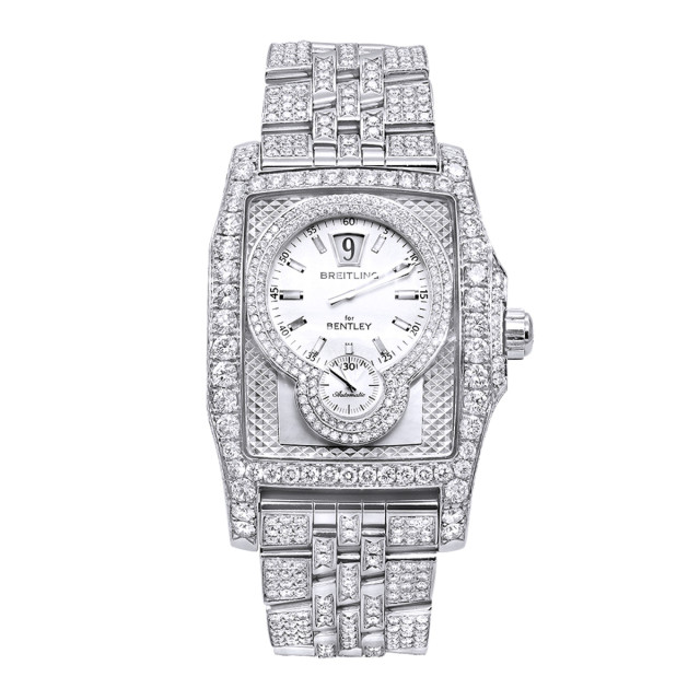 This Men's Bust Down Breitling Bentley Flying B is a luxurious and stylish watch. It features a Silver color scheme, adding sophistication to its design. The watch is made of Stainless Steel, offering a premium feel. The case measures 38.5 mm. The case is adorned with White Diamonds, enhancing its elegance. The bracelet is made of White Stainless Steel and is set with White Diamonds. The bezel is made of White Stainless Steel and is set with White Diamonds. The dial is White, enhancing its visual appeal. Powered by an Automatic movement, the watch includes functions such as Date Indicator. Offered in Very Good condition, and comes with a seller's warranty of 60 months. Also available on custom order with additional options.