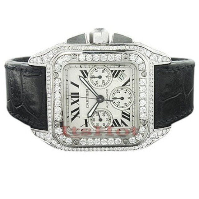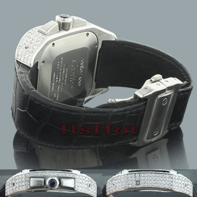 This Men's Cartier Santos de Cartier. The watch is made of Stainless Steel, offering a premium feel. The case measures 41 mm. The case is adorned with Diamonds, enhancing its elegance. And is set with Diamonds. The dial is Ivory, and comes with a seller's warranty of months. Also available on custom order with additional options. Please note this Cartier watch is pre-owned, in excellent condition, the diamonds are high quality, natural diamonds, set by our master craftsmen, watch box might show signs of wear (watch itself will be in perfect condition), comes with a 5 year warranty from ItsHot.