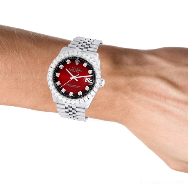 This Men's Rolex Datejust is a luxurious and stylish watch. It features a White color scheme, adding sophistication to its design. The watch is made of Stainless Steel, offering a premium feel. The case measures 36 mm. The bracelet is made of White Stainless Steel It features a Jubilee style bracelet for a comfortable fit. The bezel is made of White Stainless Steel and is set with White Diamonds. The dial is Dark Red, enhancing its visual appeal. Powered by an Automatic movement, the watch includes functions such as Date Indicator. Offered in Very Good condition, and comes with a seller's warranty of 60 months. Also available on custom order with additional options. These pre-owned Rolex watches are authentic Rolex watches with genuine diamonds, in excellent condition, they are checked for authenticity and basic water resistance. Watches will withstand an occasional rain just fine, but they are not diver's watches and should not be worn in shower or while swimming.
