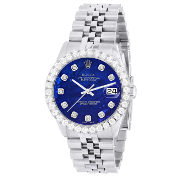 This Men's Rolex Datejust is a luxurious and stylish watch. It features a White color scheme, adding sophistication to its design. The watch is made of Stainless Steel, offering a premium feel. The case measures 36 mm. The bracelet is made of White Stainless Steel It features a Jubilee style bracelet for a comfortable fit. The bezel is made of White Stainless Steel and is set with White Diamonds. The dial is Blue, enhancing its visual appeal. Powered by an Automatic movement, the watch includes functions such as Date Indicator. Offered in Very Good condition, and comes with a seller's warranty of 60 months. Also available on custom order with additional options. These pre-owned Rolex watches are authentic Rolex watches with genuine diamonds, in excellent condition, they are checked for authenticity and basic water resistance. Watches will withstand an occasional rain just fine, but they are not diver's watches and should not be worn in shower or while swimming.