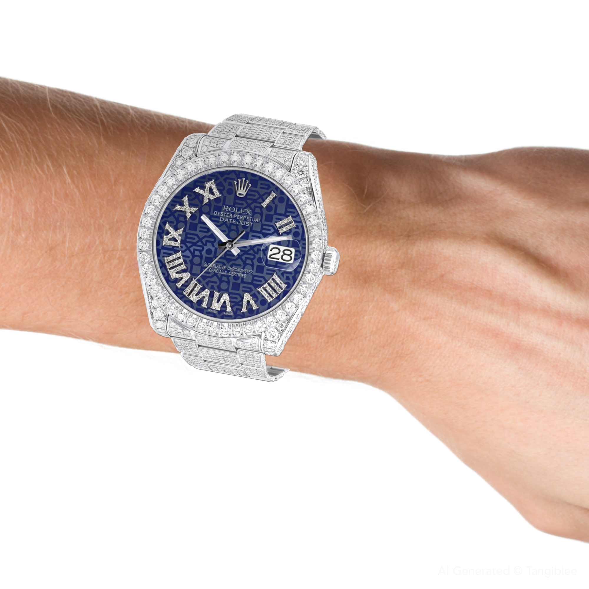 This Men's Bust Down Rolex Datejust is a luxurious and stylish watch. It features a White color scheme, adding sophistication to its design. The watch is made of Stainless Steel, offering a premium feel. The case measures 41 mm. The bracelet is made of White Stainless Steel It features an Oyster style bracelet for a comfortable fit. The bezel is made of White Stainless Steel and is set with White Diamonds. The dial is Blue Print, enhancing its visual appeal. Powered by an Automatic movement, the watch includes functions such as Date Indicator. Offered in Very Good condition, and comes with a seller's warranty of 60 months. Also available on custom order with additional options. These pre-owned Rolex watches are authentic Rolex watches with genuine diamonds, in excellent condition, they are checked for authenticity and basic water resistance. Watches will withstand an occasional rain just fine, but they are not diver's watches and should not be worn in shower or while swimming.