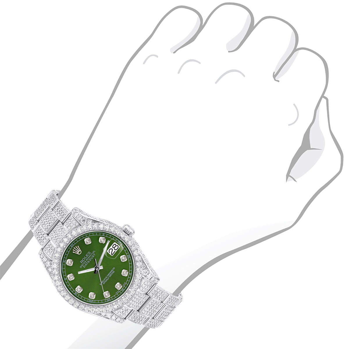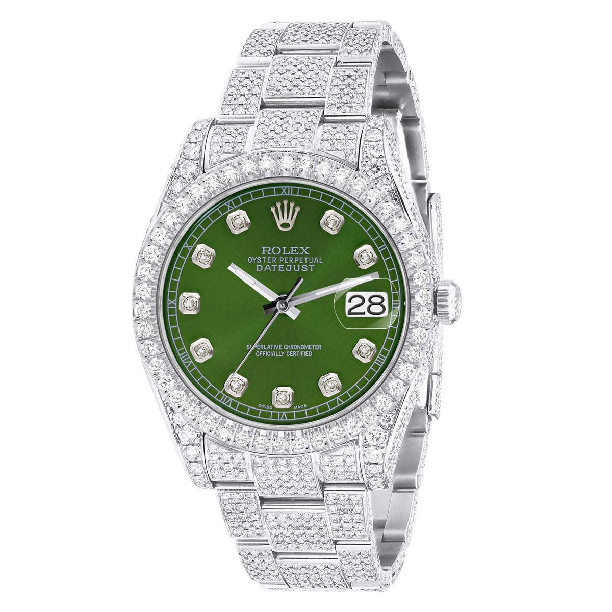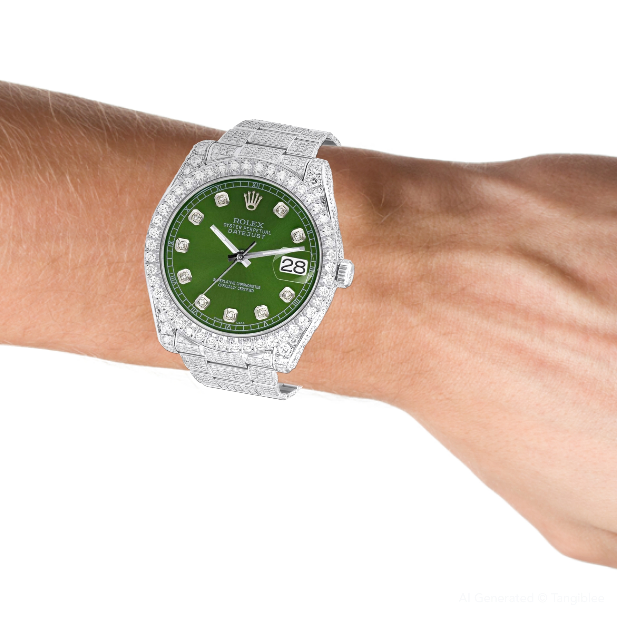 This Men's Bust Down Rolex Datejust is a luxurious and stylish watch. It features a White color scheme, adding sophistication to its design. The watch is made of Stainless Steel, offering a premium feel. The case measures 41 mm. The bracelet is made of White Stainless Steel It features an Oyster style bracelet for a comfortable fit. The bezel is made of White Stainless Steel and is set with White Diamonds. The dial is Green, enhancing its visual appeal. Powered by an Automatic movement, the watch includes functions such as Date Indicator. Offered in Very Good condition, and comes with a seller's warranty of 60 months. Also available on custom order with additional options. These pre-owned Rolex watches are authentic Rolex watches with genuine diamonds, in excellent condition, they are checked for authenticity and basic water resistance. Watches will withstand an occasional rain just fine, but they are not diver's watches and should not be worn in shower or while swimming.