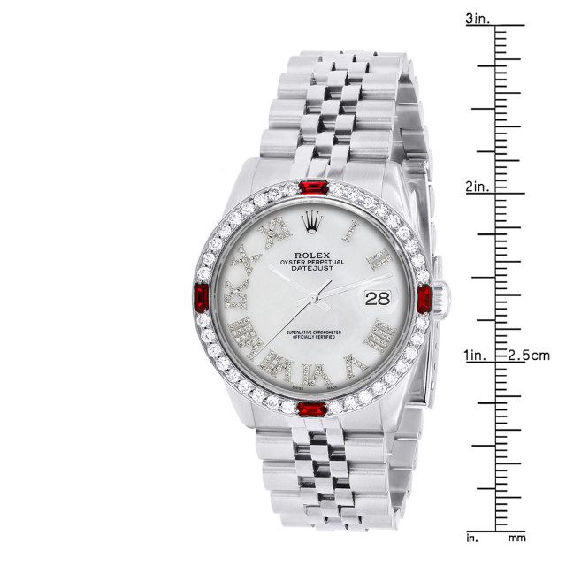 This Men's Rolex Oyster Perpetual Datejust is a luxurious and stylish watch. It features a White color scheme, adding sophistication to its design. The watch is made of Stainless Steel, offering a premium feel. The case measures 36 mm. The bracelet is made of White Stainless Steel It features a Jubilee style bracelet for a comfortable fit. The bezel is made of White Stainless Steel and is set with White Diamonds. The dial is White, enhancing its visual appeal. Powered by an Automatic movement, the watch includes functions such as Date Indicator. Offered in Very Good condition, and comes with a seller's warranty of 60 months. Also available on custom order with additional options. These pre-owned Rolex watches are authentic Rolex watches with genuine diamonds, in excellent condition, they are checked for authenticity and basic water resistance. Watches will withstand an occasional rain just fine, but they are not diver's watches and should not be worn in shower or while swimming.