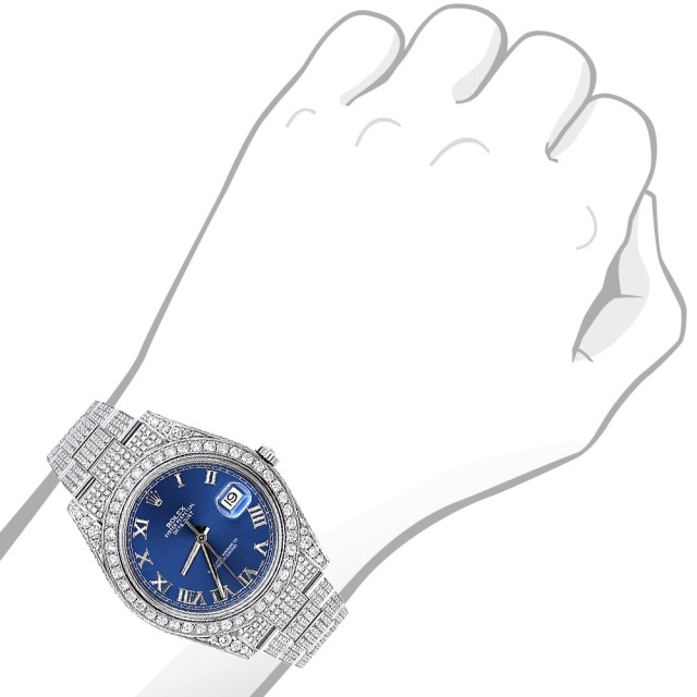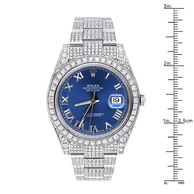 This Men's Bust Down Rolex Oyster Perpetual Datejust is a luxurious and stylish watch. The watch is made of Stainless Steel, offering a premium feel. The case measures 41 mm. The case is adorned with White Diamonds, enhancing its elegance. The bracelet is made of White Stainless Steel and is set with White. It features an Oyster style bracelet for a comfortable fit. The bezel is made of White Stainless Steel and is set with White Diamonds. The dial is Blue, enhancing its visual appeal the watch includes functions such as Date Indicator. Offered in Very Good condition, and comes with a seller's warranty of 60 months. Also available on custom order with additional options. These pre-owned Rolex watches are authentic Rolex watches with genuine diamonds, in excellent condition, they are checked for authenticity and basic water resistance. Watches will withstand an occasional rain just fine, but they are not diver's watches and should not be worn in shower or while swimming.