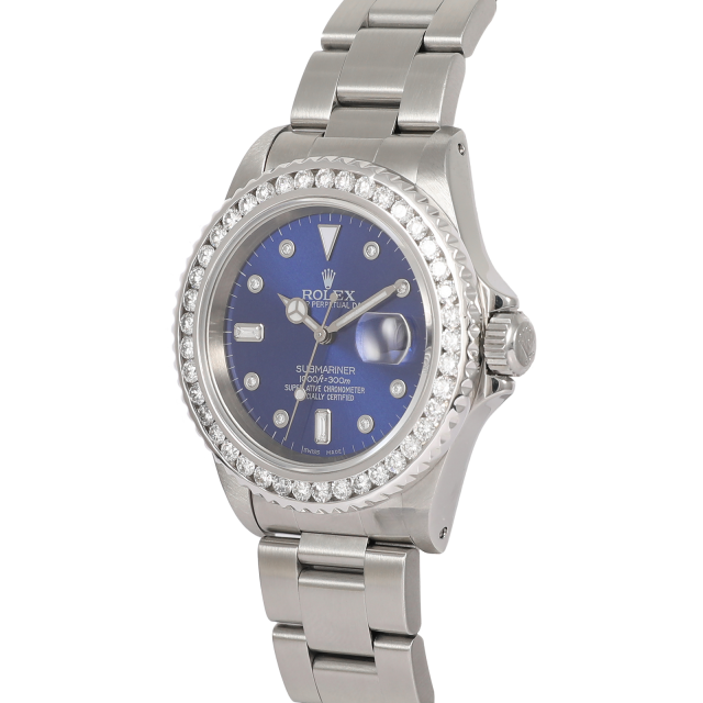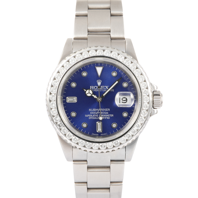 This Men's Rolex Submariner is a luxurious and stylish watch. The watch is made of Stainless Steel, offering a premium feel. The case measures 40 mm. The bracelet is made of Stainless Steel It features an Oyster style bracelet for a comfortable fit. The bezel is made of Stainless Steel and is set with White Diamonds. The dial is Blue, enhancing its visual appeal. Powered by an Automatic movement. Offered in Good condition, and comes with a seller's warranty of 60 months. Also available on custom order with additional options. These pre-owned Rolex watches are authentic Rolex watches with genuine diamonds, in excellent condition, they are checked for authenticity and basic water resistance. Watches will withstand an occasional rain just fine, but they are not diver's watches and should not be worn in shower or while swimming.