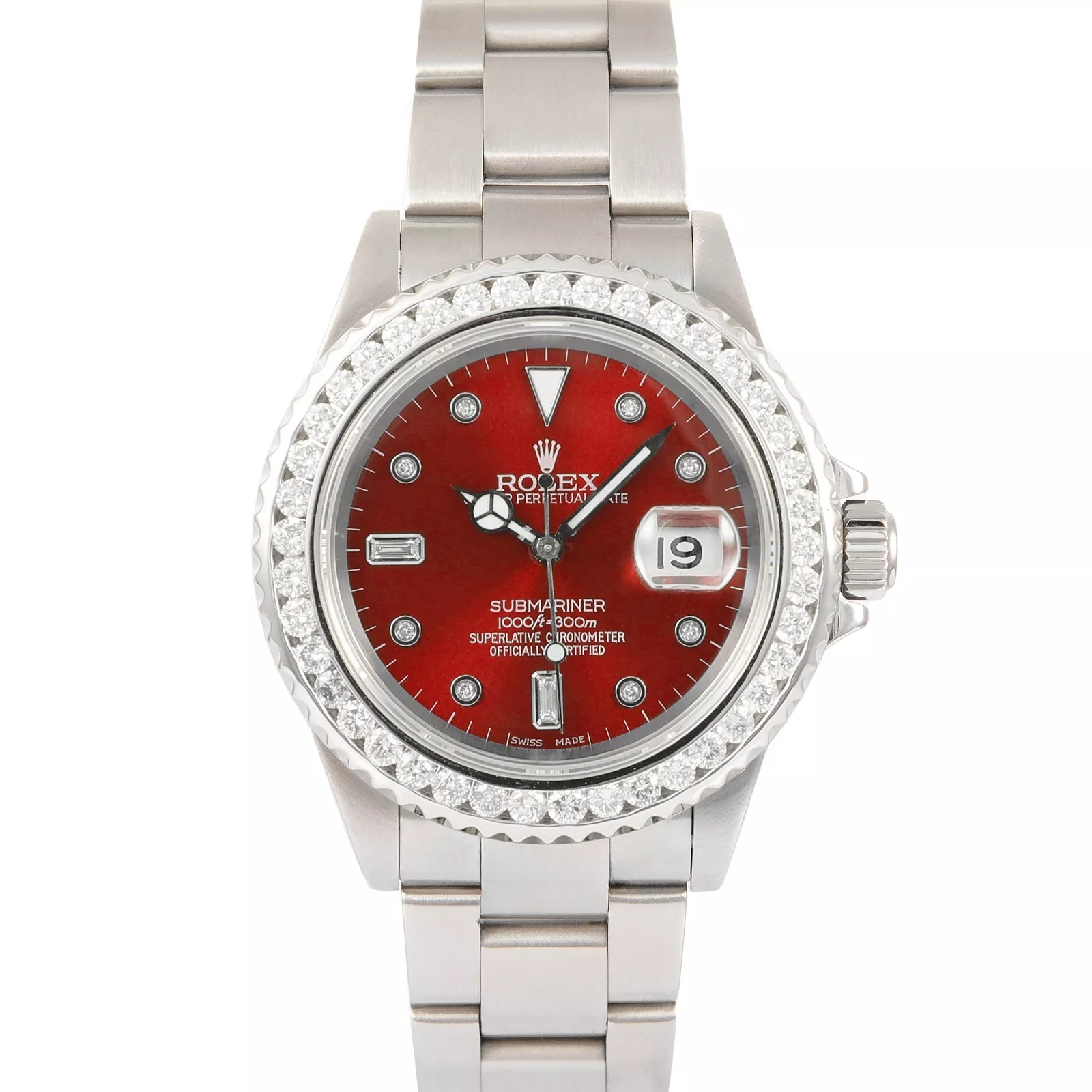 This Men's Rolex Submariner is a luxurious and stylish watch. The watch is made of Stainless Steel, offering a premium feel. The case measures 40 mm. The bracelet is made of Stainless Steel It features an Oyster style bracelet for a comfortable fit. The bezel is made of Stainless Steel and is set with White Diamonds. The dial is Red, enhancing its visual appeal. Powered by an Automatic movement. Offered in Good condition, and comes with a seller's warranty of 60 months. Also available on custom order with additional options. These pre-owned Rolex watches are authentic Rolex watches with genuine diamonds, in excellent condition, they are checked for authenticity and basic water resistance. Watches will withstand an occasional rain just fine, but they are not diver's watches and should not be worn in shower or while swimming.