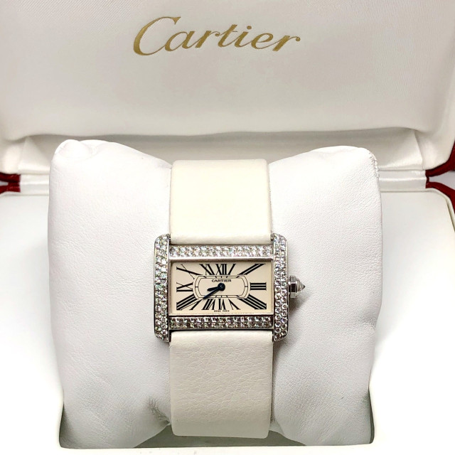 This Women's Cartier Divan is a luxurious and stylish watch. The watch is made of Stainless Steel, offering a premium feel. The case measures 31 mm. The bracelet is made of White Leather. The bezel is made of Stainless Steel and is set with Diamonds. The dial is Cream, enhancing its visual appeal. Powered by a Quartz movement. Offered in Very Good condition, and comes with a seller's warranty of 60 months. Also available on custom order with additional options.
