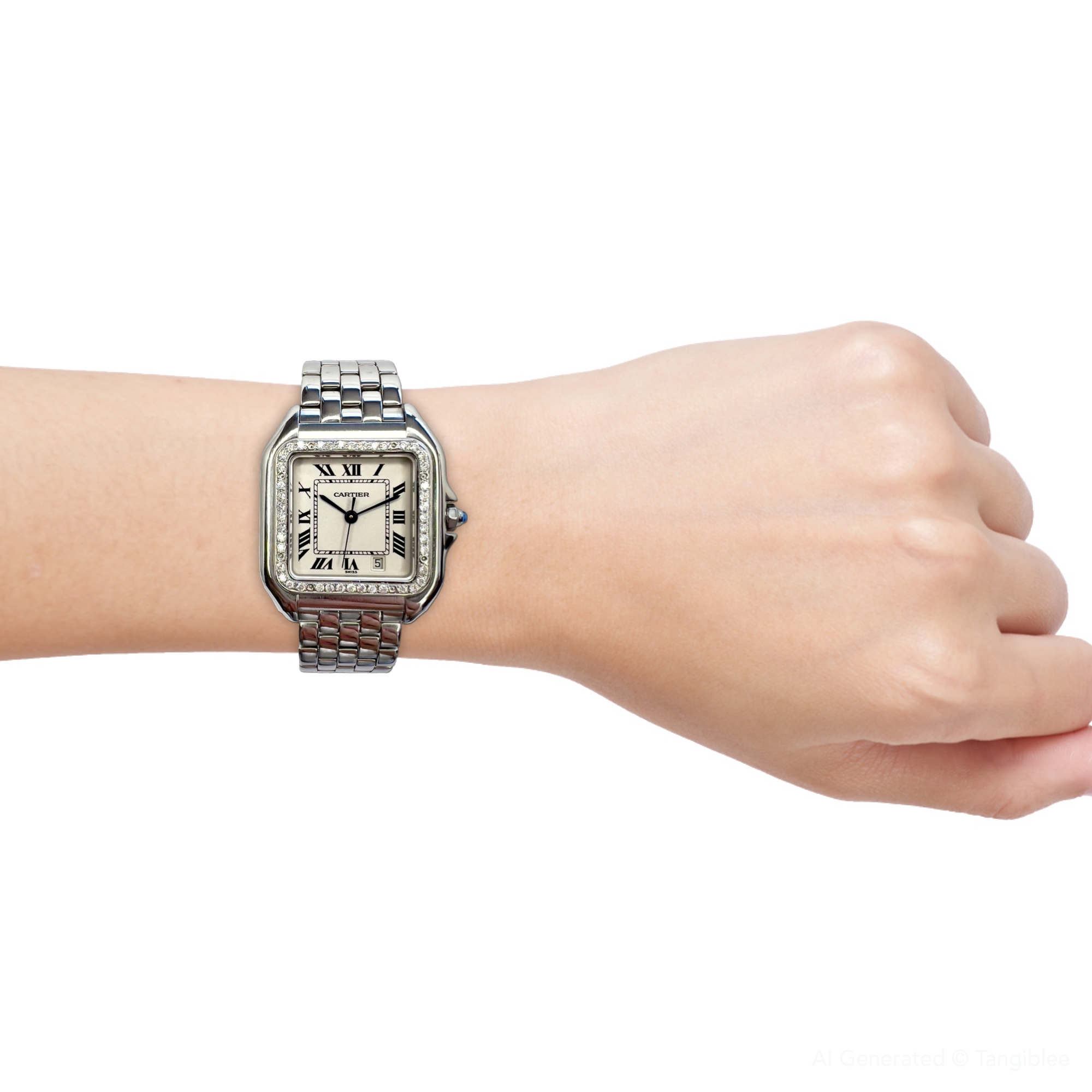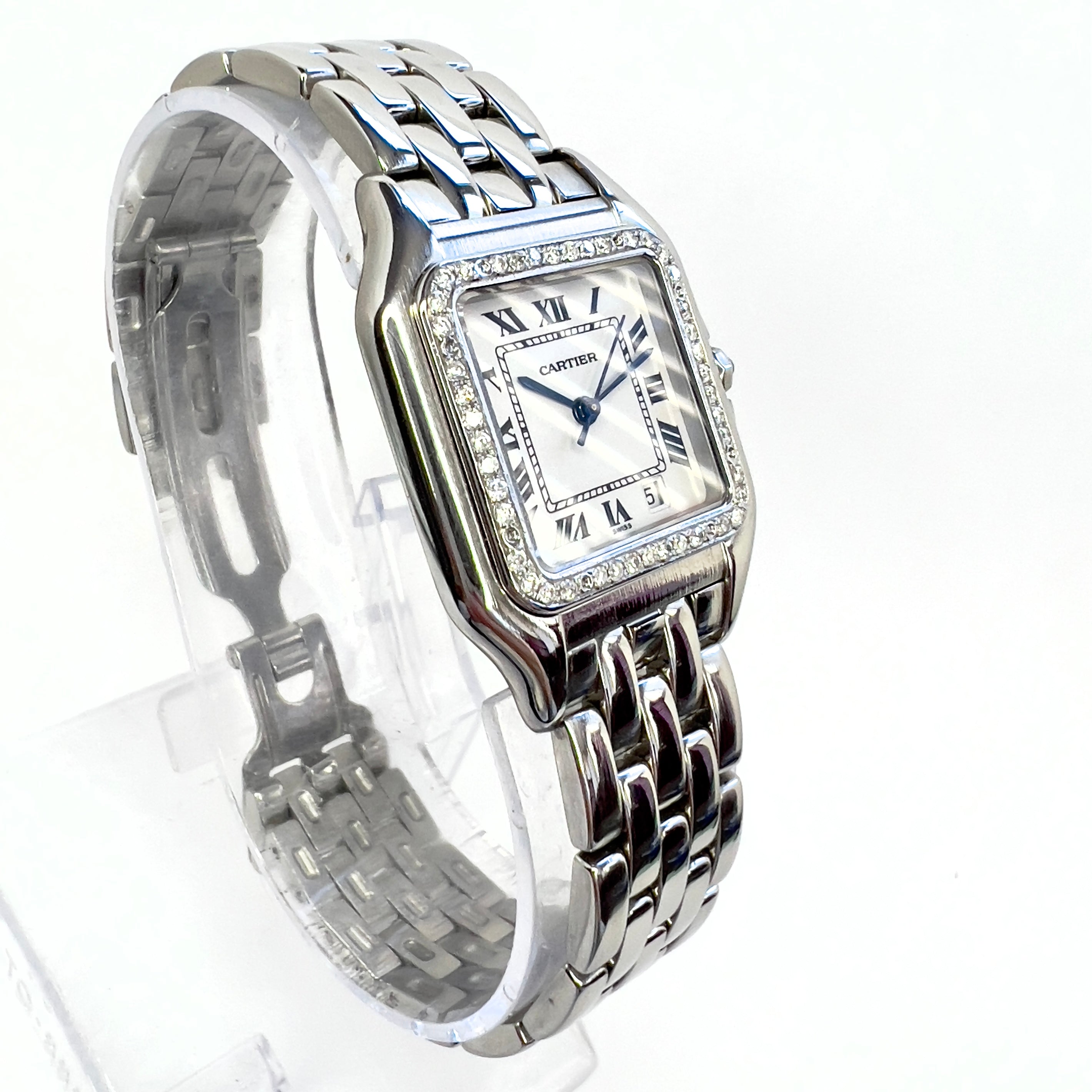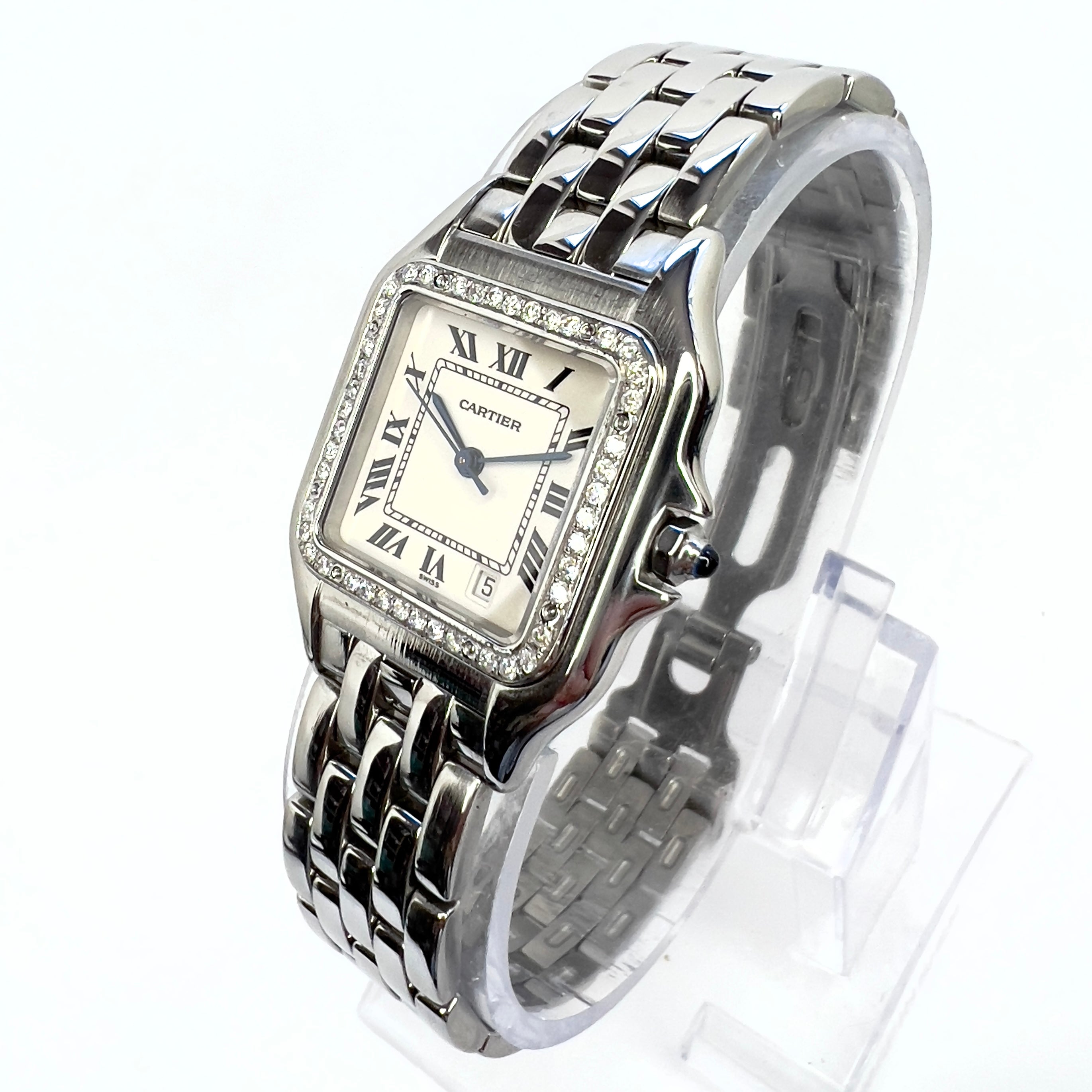 This Women's Cartier La Panthere is a luxurious and stylish watch. The watch is made of Stainless Steel, offering a premium feel. The case measures 27 mm. The bezel is made of Stainless Steel and is set with White Diamonds. The dial is Cream, enhancing its visual appeal. Powered by a Swiss-Quartz movement. Offered in Good condition, and comes with a seller's warranty of 60 months. Also available on custom order with additional options.