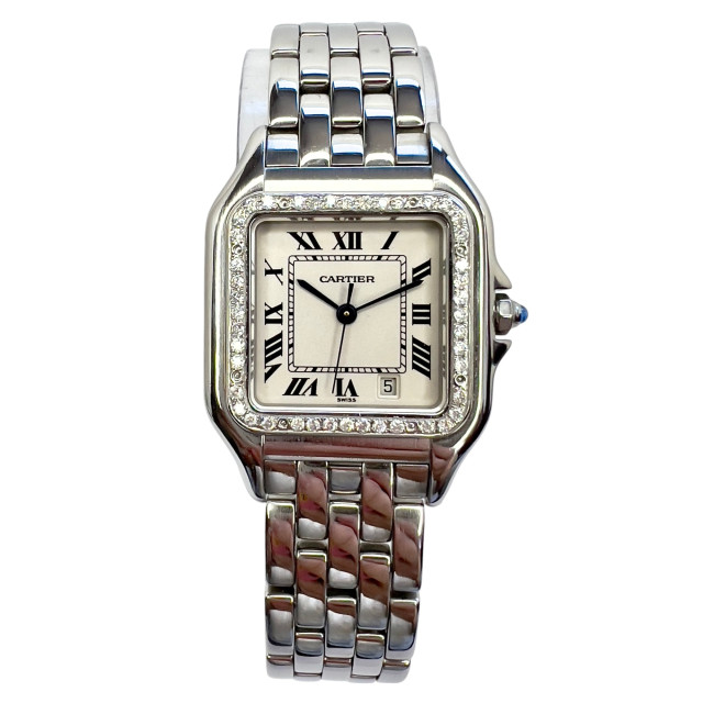 This Women's Cartier La Panthere is a luxurious and stylish watch. The watch is made of Stainless Steel, offering a premium feel. The case measures 27 mm. The bezel is made of Stainless Steel and is set with White Diamonds. The dial is Cream, enhancing its visual appeal. Powered by a Swiss-Quartz movement. Offered in Good condition, and comes with a seller's warranty of 60 months. Also available on custom order with additional options. Please note this Cartier watch is pre-owned, in excellent condition, the diamonds are high quality, natural diamonds, set by our master craftsmen, watch box might show signs of wear (watch itself will be in perfect condition), comes with a 5 year warranty from ItsHot.