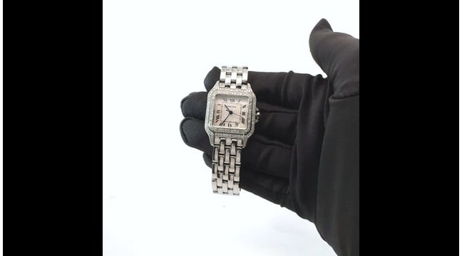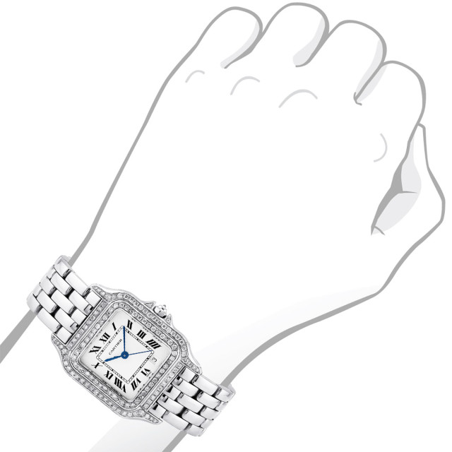 This Women's Cartier Panthere is a luxurious and stylish watch. The watch is made of Stainless Steel, offering a premium feel. The case measures 27 mm. The case is adorned with Diamonds, enhancing its elegance. The bracelet is made of Stainless Steel. The bezel is made of Stainless Steel and is set with Diamonds. The dial is White, enhancing its visual appeal. Powered by a Swiss-Quartz movement, the watch includes functions such as Date Indicator. Offered in Very Good condition, and comes with a seller's warranty of 60 months. Also available on custom order with additional options.