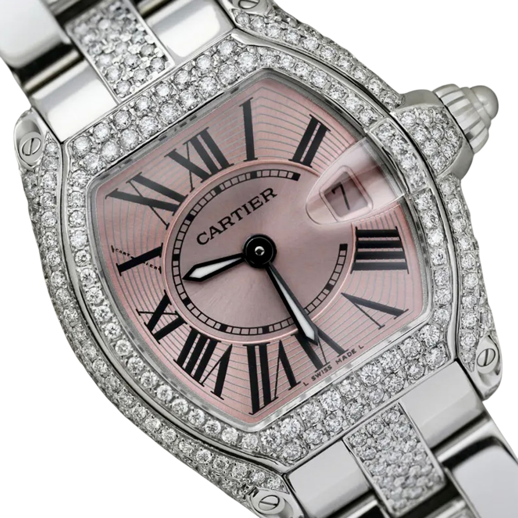 This Women's Cartier Roadster is a luxurious and stylish watch. The watch is made of Stainless Steel, offering a premium feel. The case measures 31 mm. The bracelet is made of Stainless Steel. The bezel is made of Stainless Steel and is set with White. The dial is Pink, enhancing its visual appeal. Powered by a Quartz movement, the watch includes functions such as Date Indicator. Offered in Good condition, and comes with a seller's warranty of 60 months. Also available on custom order with additional options.