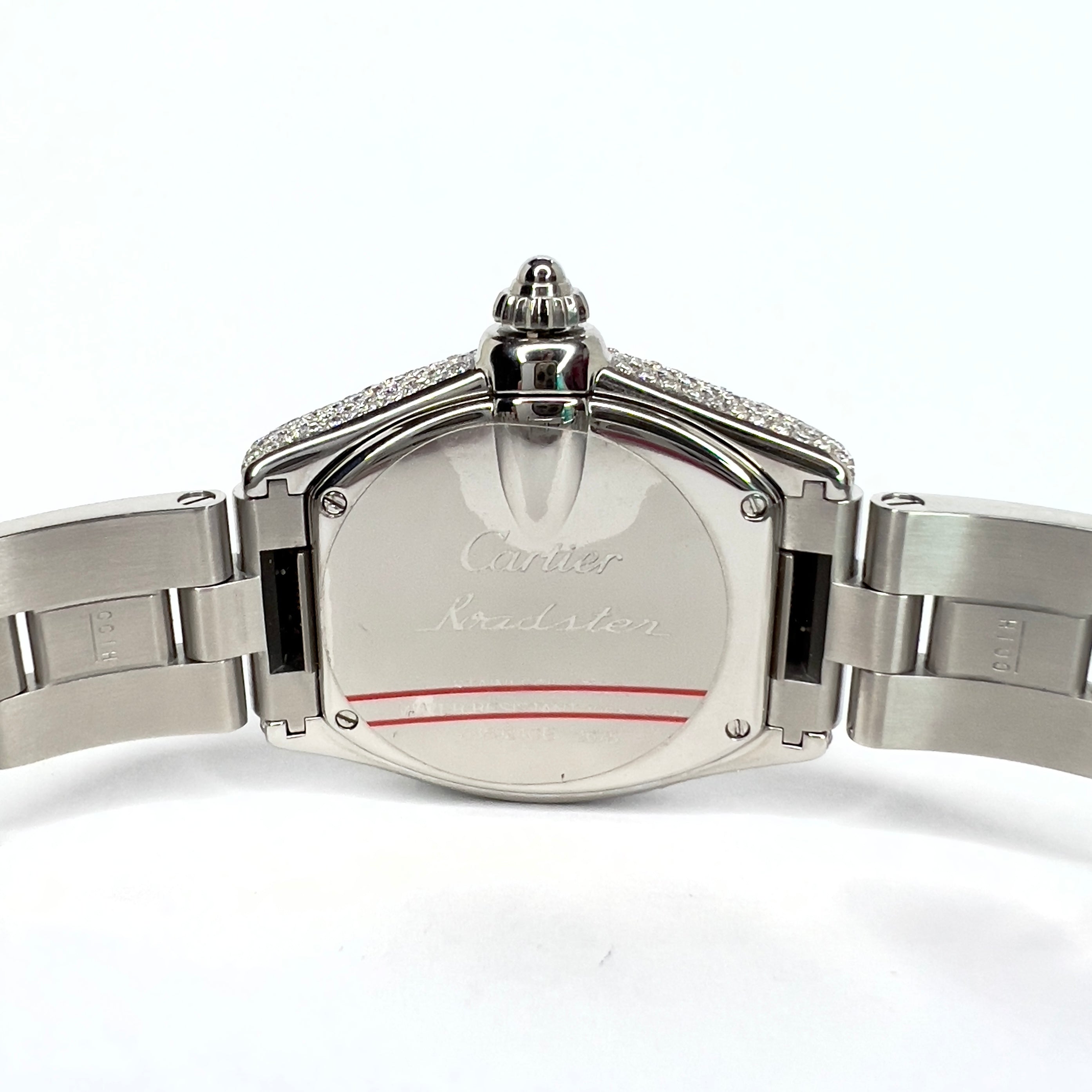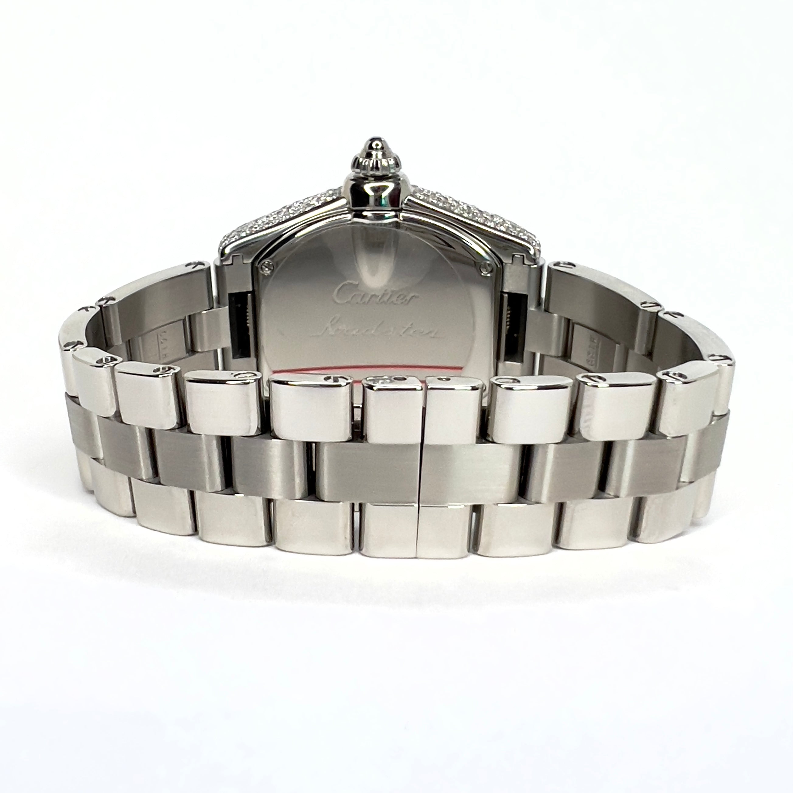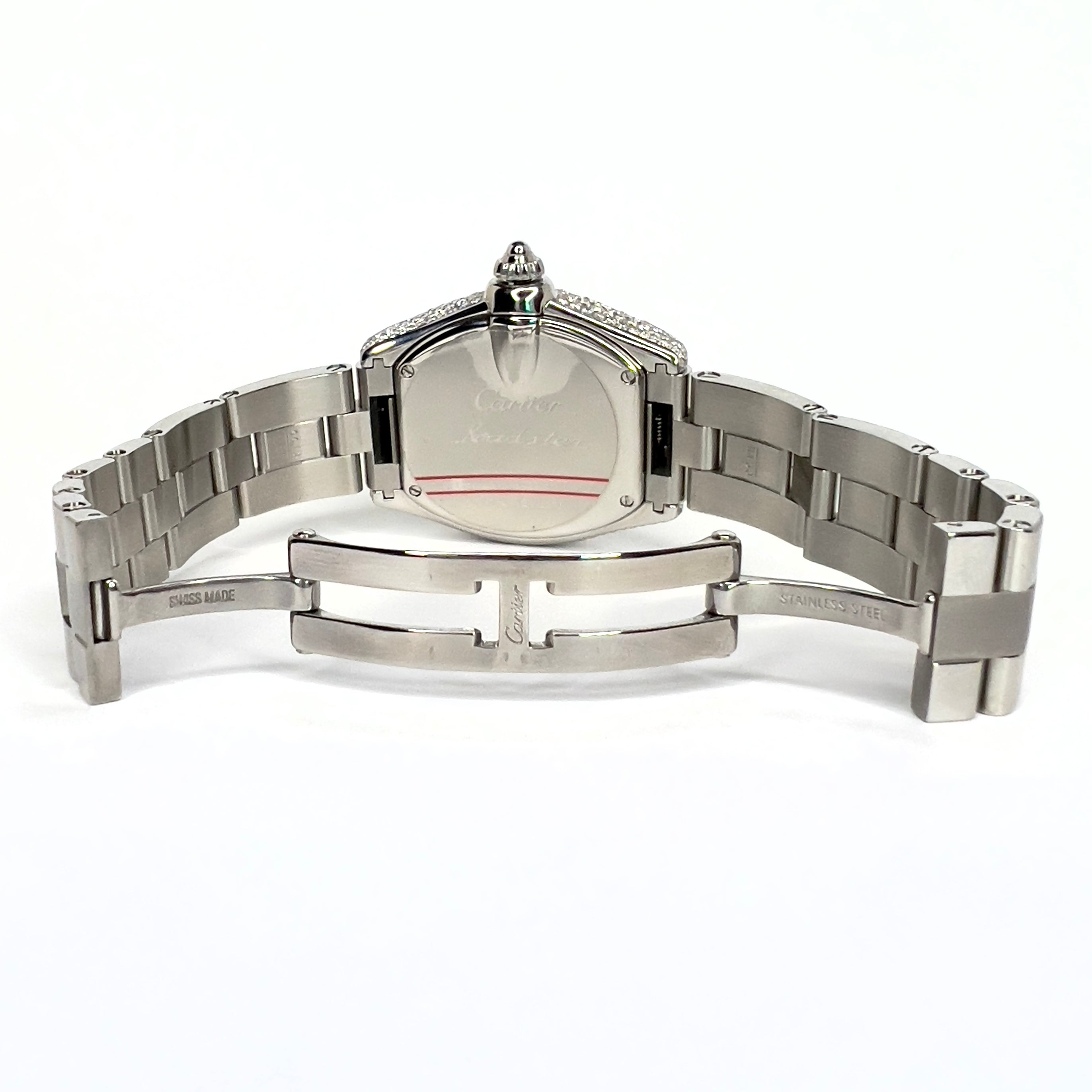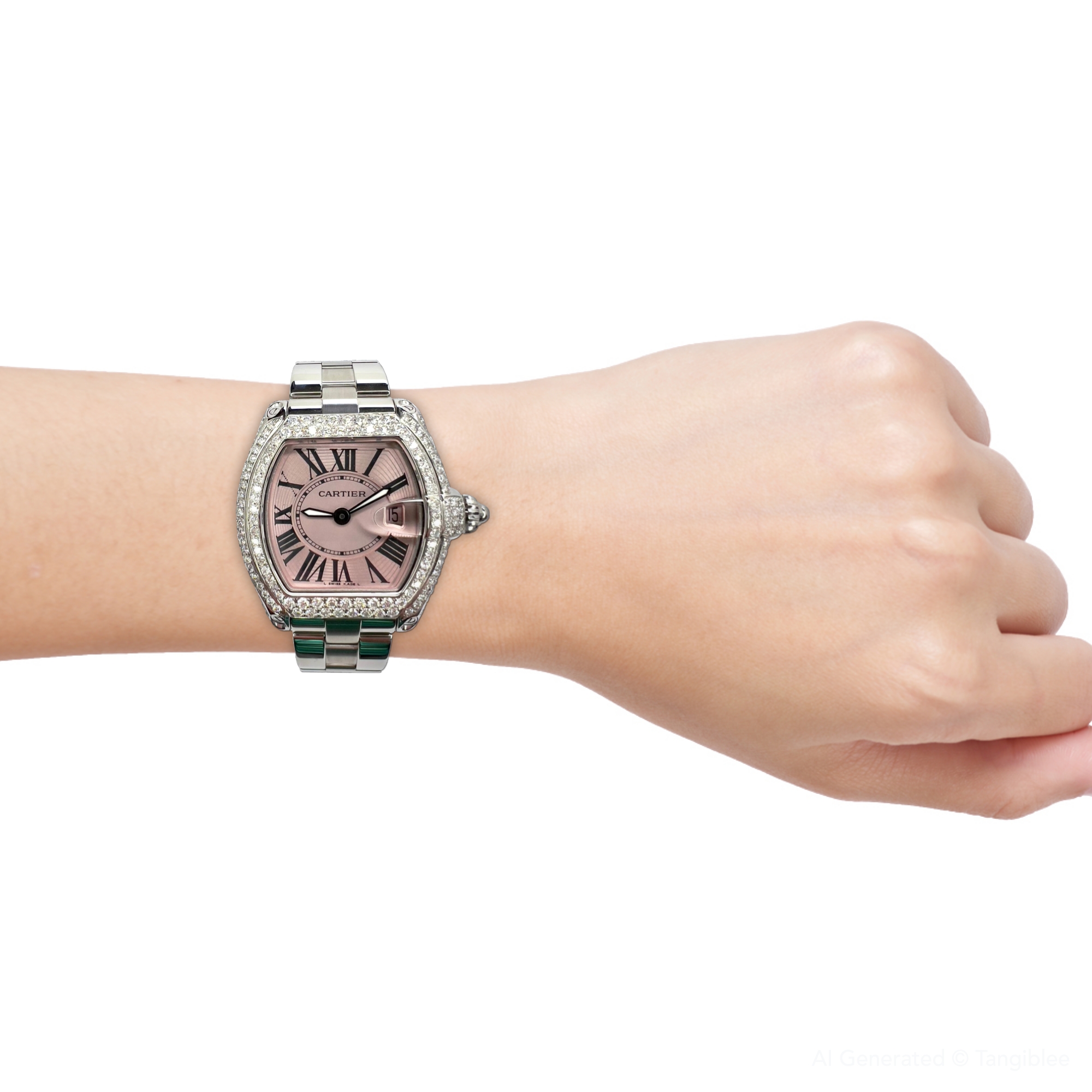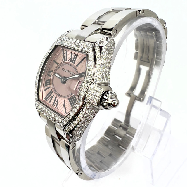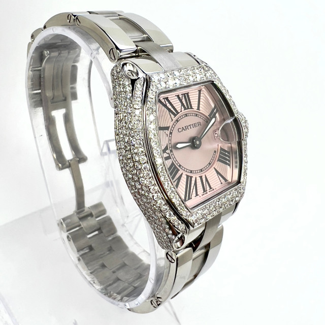 This Women's Cartier Roadster is a luxurious and stylish watch. The watch is made of Stainless Steel, offering a premium feel. The case measures 31 mm. The bracelet is made of Stainless Steel. The bezel is made of Stainless Steel and is set with White. The dial is Pink, enhancing its visual appeal. Powered by a Quartz movement, the watch includes functions such as Date Indicator. Offered in Good condition, and comes with a seller's warranty of 60 months. Also available on custom order with additional options.