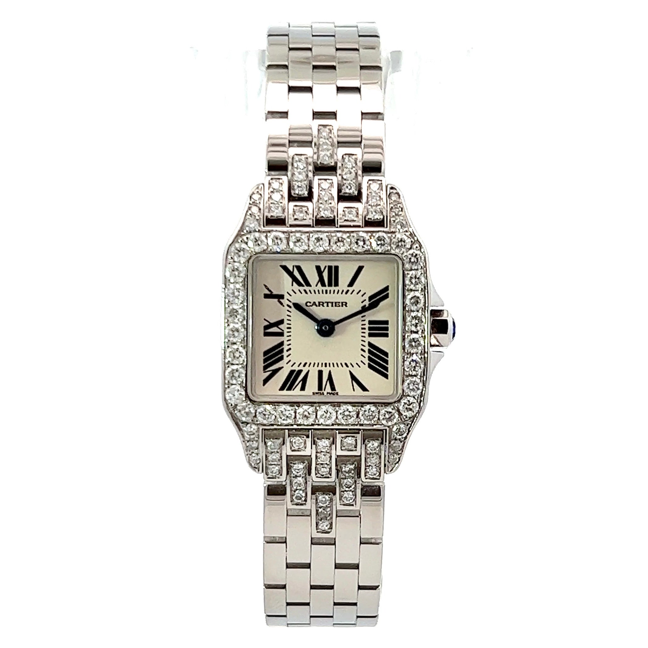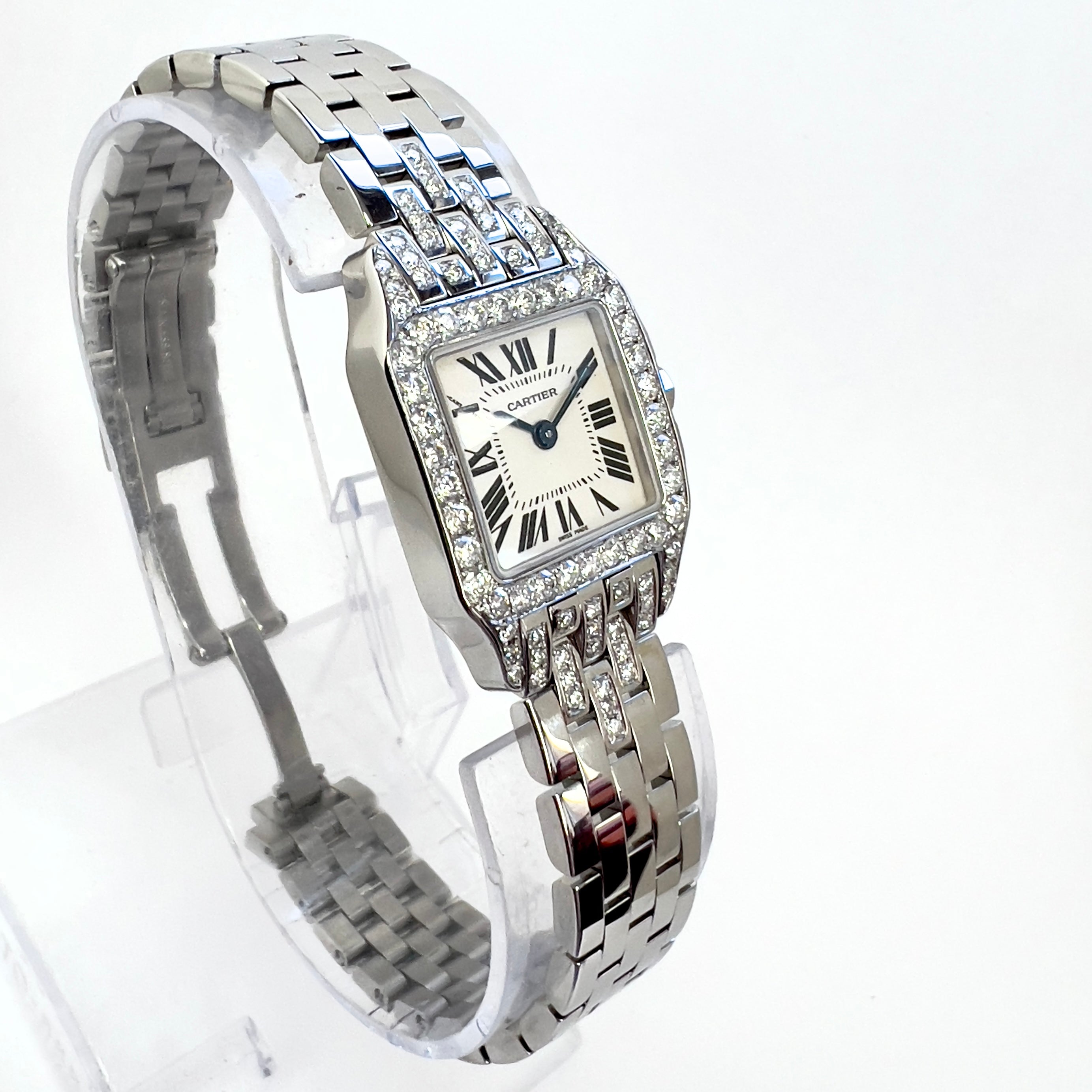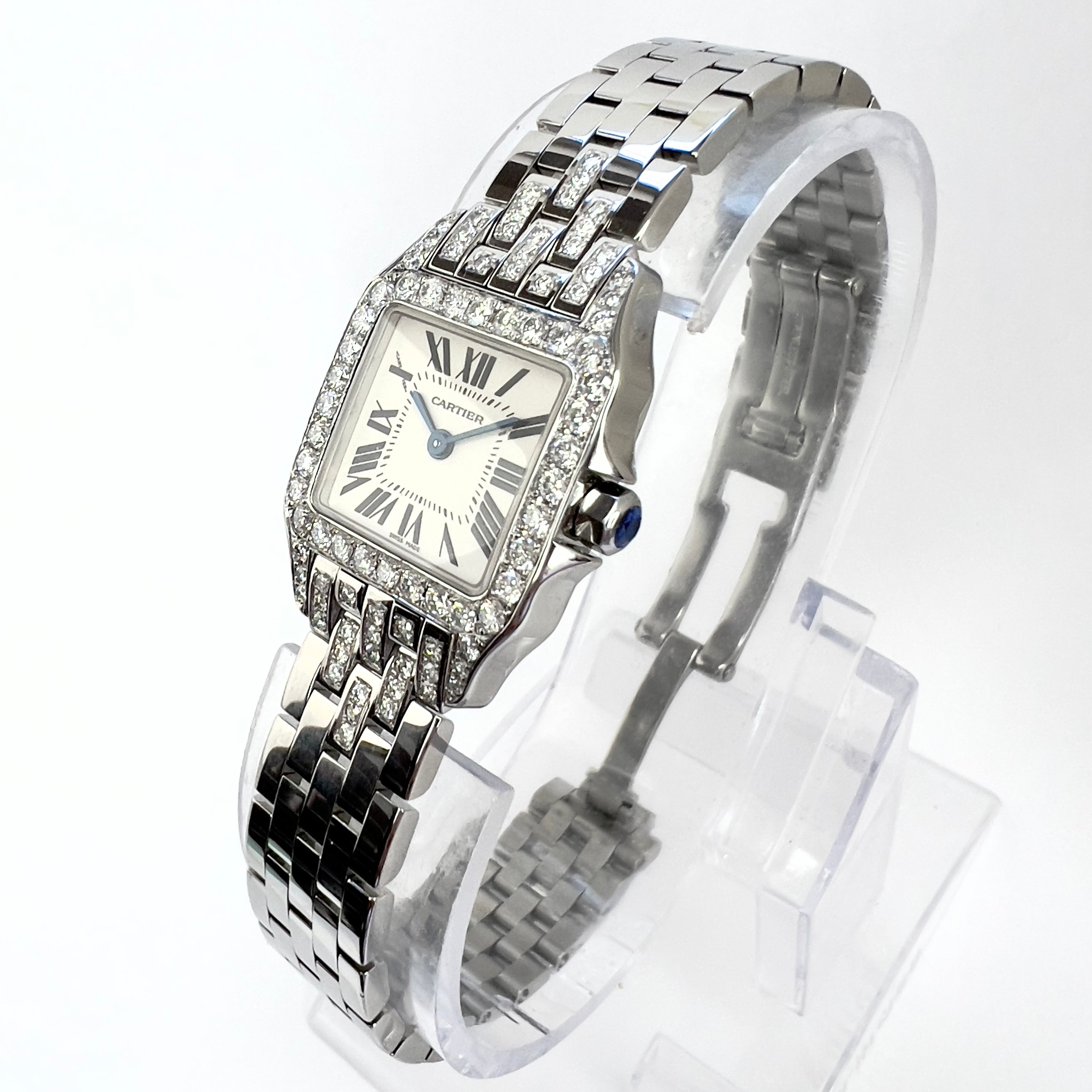 This Women's Cartier Santos Demoiselle is a luxurious and stylish watch. The watch is made of Stainless Steel, offering a premium feel. The case measures 20 mm. The case is adorned with White s, enhancing its elegance. The bracelet is made of White Stainless Steel. The bezel is made of White Stainless Steel and is set with White. The dial is Cream, enhancing its visual appeal. Powered by a Quartz movement. Offered in Good condition, and comes with a seller's warranty of 60 months. Also available on custom order with additional options.