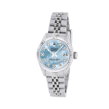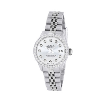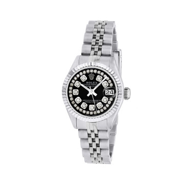 This Women's Rolex Datejust is a luxurious and stylish watch. The watch is made of Stainless Steel, offering a premium feel. The case measures 26 mm. The bracelet is made of Stainless Steel. The bezel is made of Stainless Steel. The dial is Black, enhancing its visual appeal. Powered by an Automatic movement. Offered in Good condition, and comes with a seller's warranty of 60 months. Also available on custom order with additional options. These pre-owned Rolex watches are authentic Rolex watches with genuine diamonds, in excellent condition, they are checked for authenticity and basic water resistance. Watches will withstand an occasional rain just fine, but they are not diver's watches and should not be worn in shower or while swimming.