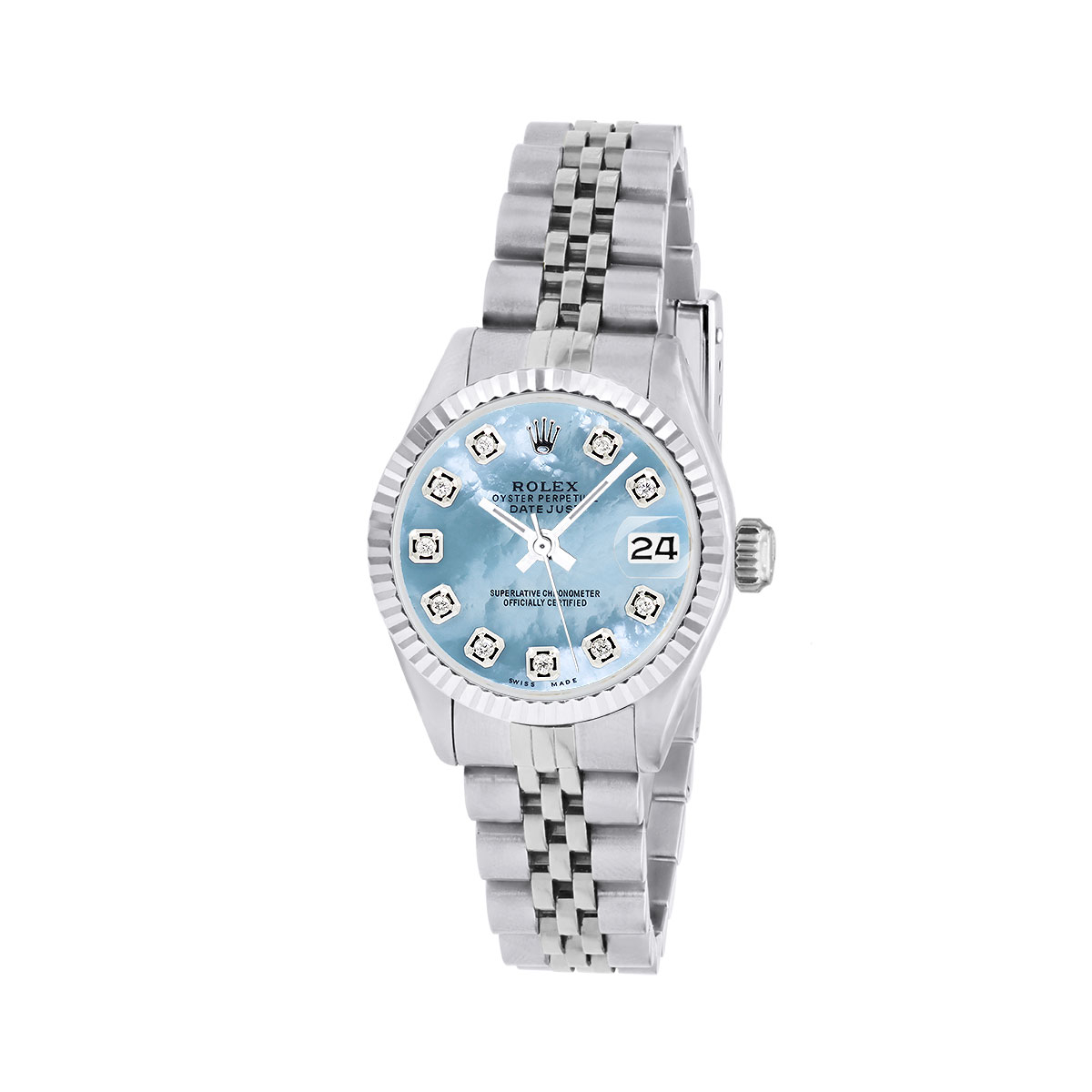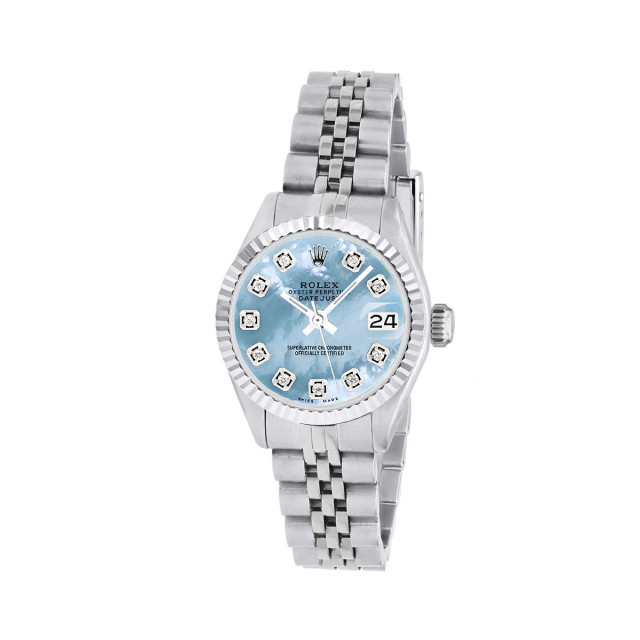 This Women's Rolex Datejust is a luxurious and stylish watch. The watch is made of Stainless Steel, offering a premium feel. The case measures 26 mm. The bracelet is made of Stainless Steel. The bezel is made of Stainless Steel. The dial is Blue, enhancing its visual appeal. Powered by an Automatic movement. Offered in Good condition, and comes with a seller's warranty of 60 months. Also available on custom order with additional options. These pre-owned Rolex watches are authentic Rolex watches with genuine diamonds, in excellent condition, they are checked for authenticity and basic water resistance. Watches will withstand an occasional rain just fine, but they are not diver's watches and should not be worn in shower or while swimming.