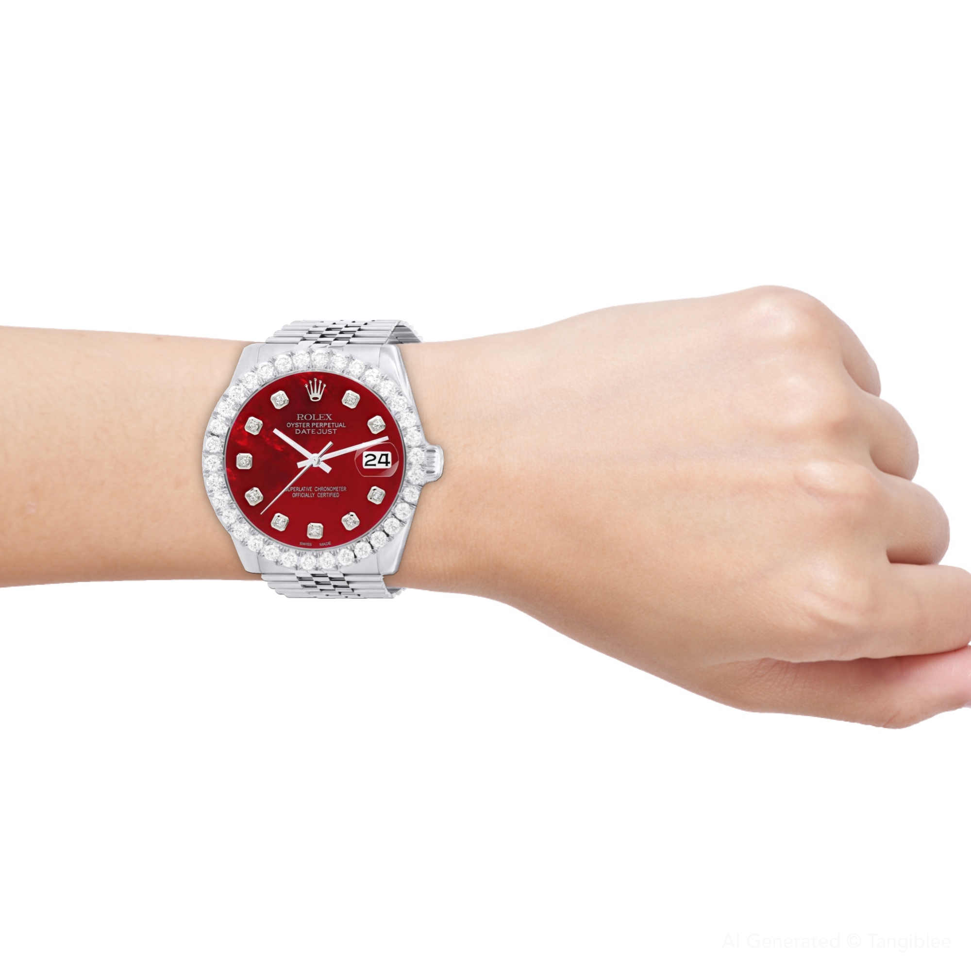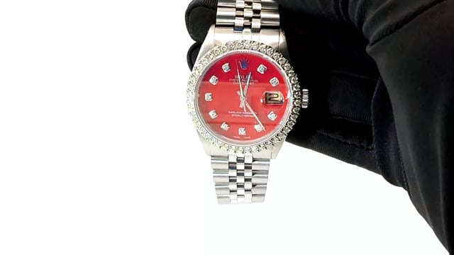 This Women's Rolex Datejust is a luxurious and stylish watch. It features a White color scheme, adding sophistication to its design. The watch is made of Stainless Steel, offering a premium feel. The case measures 36 mm. The bracelet is made of White Stainless Steel It features a Jubilee style bracelet for a comfortable fit. The bezel is made of White Stainless Steel and is set with White Diamonds. The dial is Red, enhancing its visual appeal. Powered by an Automatic movement, the watch includes functions such as Date Indicator. Offered in Very Good condition, and comes with a seller's warranty of 60 months. Also available on custom order with additional options. These pre-owned Rolex watches are authentic Rolex watches with genuine diamonds, in excellent condition, they are checked for authenticity and basic water resistance. Watches will withstand an occasional rain just fine, but they are not diver's watches and should not be worn in shower or while swimming.
