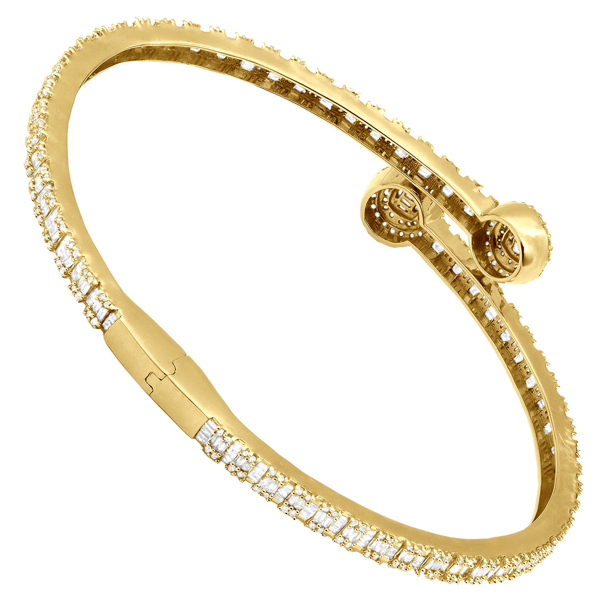 This Women's Diamond Bangle bracelet is made from 10k Gold, weighing 10 grams and is 15 mm wide and length inches. This Women's Diamond bracelet features 3.5 carats of White Diamonds, showcasing a chain and is available in 10k white gold, yellow gold and rose gold as well as 14k gold, 18k gold and platinum as a custom order.