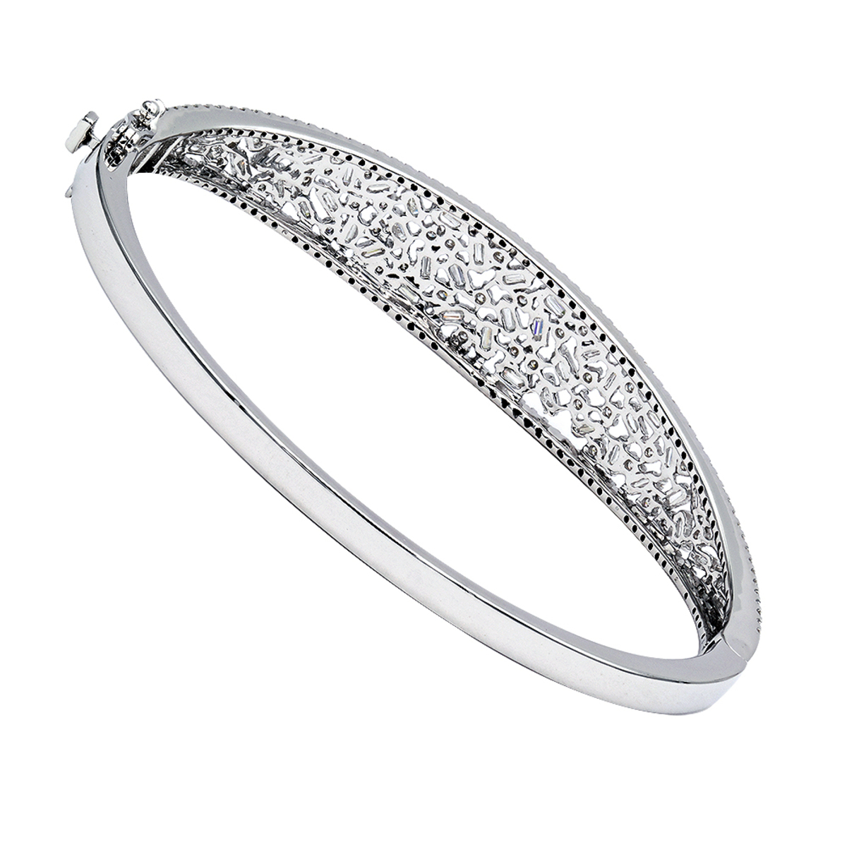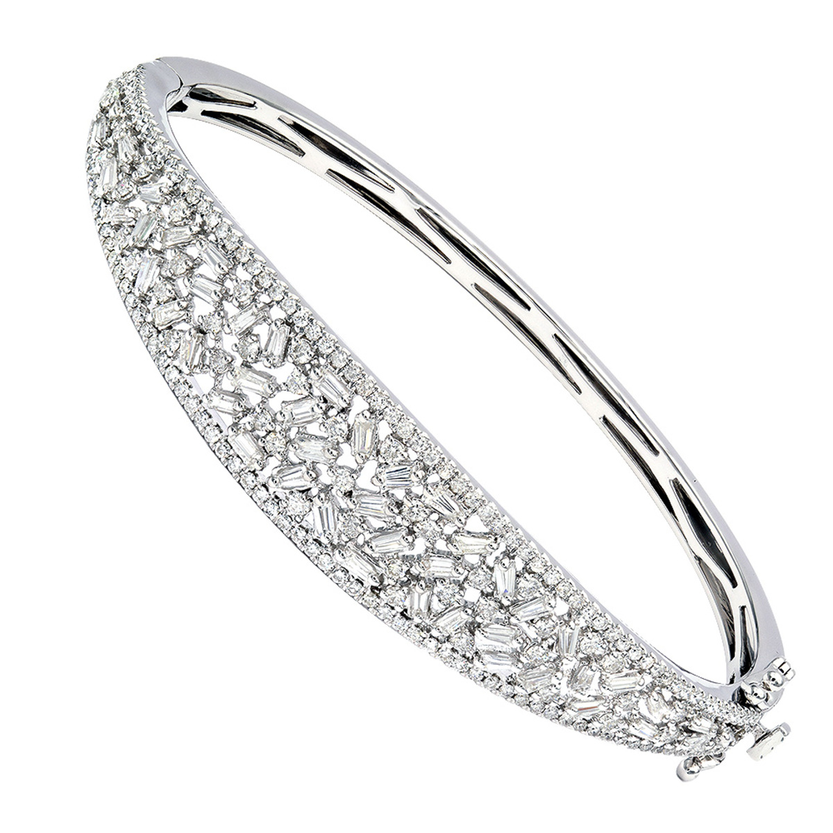 This Women's Diamond Bangle bracelet is made from 14k Gold, weighing 16 grams and is 12 mm wide and length inches. This Women's Diamond bracelet features 3 carats of White Diamonds, showcasing a chain and is available in 14k white gold, yellow gold and rose gold as well as 18k gold and platinum as a custom order.