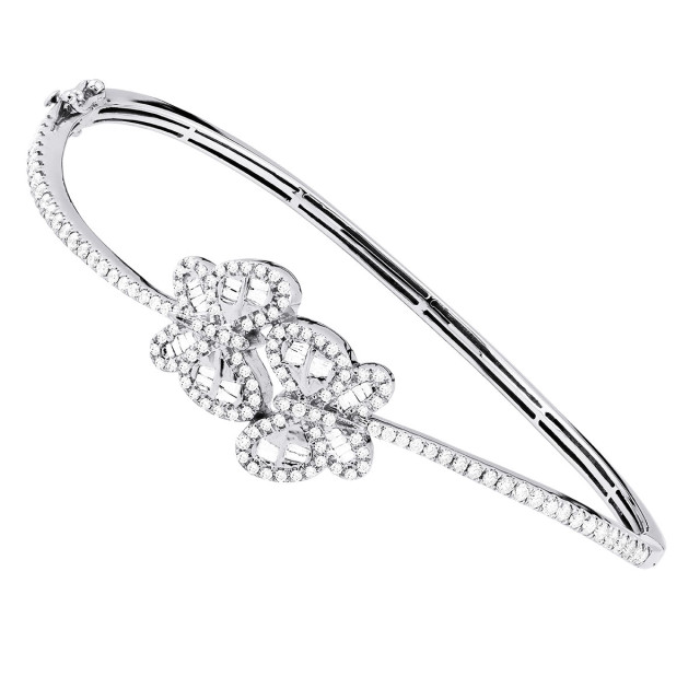 This Women's Diamond Bangle bracelet is made from 14k Gold, weighing 13.29 grams and is 18 mm wide and length inches. This Women's Diamond bracelet features 1.75 carats of White Diamonds, showcasing a chain and is available in 14k white gold, yellow gold and rose gold as well as 18k gold and platinum as a custom order.