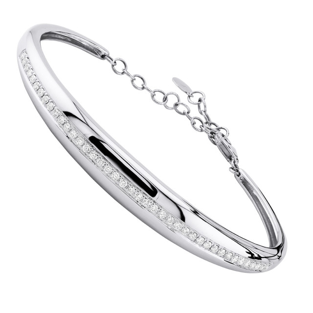This Women's Diamond Bangle bracelet is made from 14k Gold, weighing 12 grams and is 8 mm wide and length inches. This Women's Diamond bracelet features 0.75 carats of White Diamonds, showcasing a chain and is available in 14k white gold, yellow gold and rose gold as well as 18k gold and platinum as a custom order.