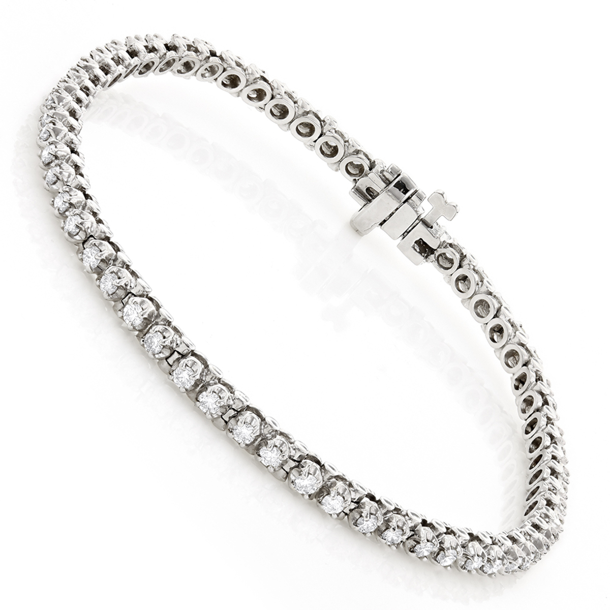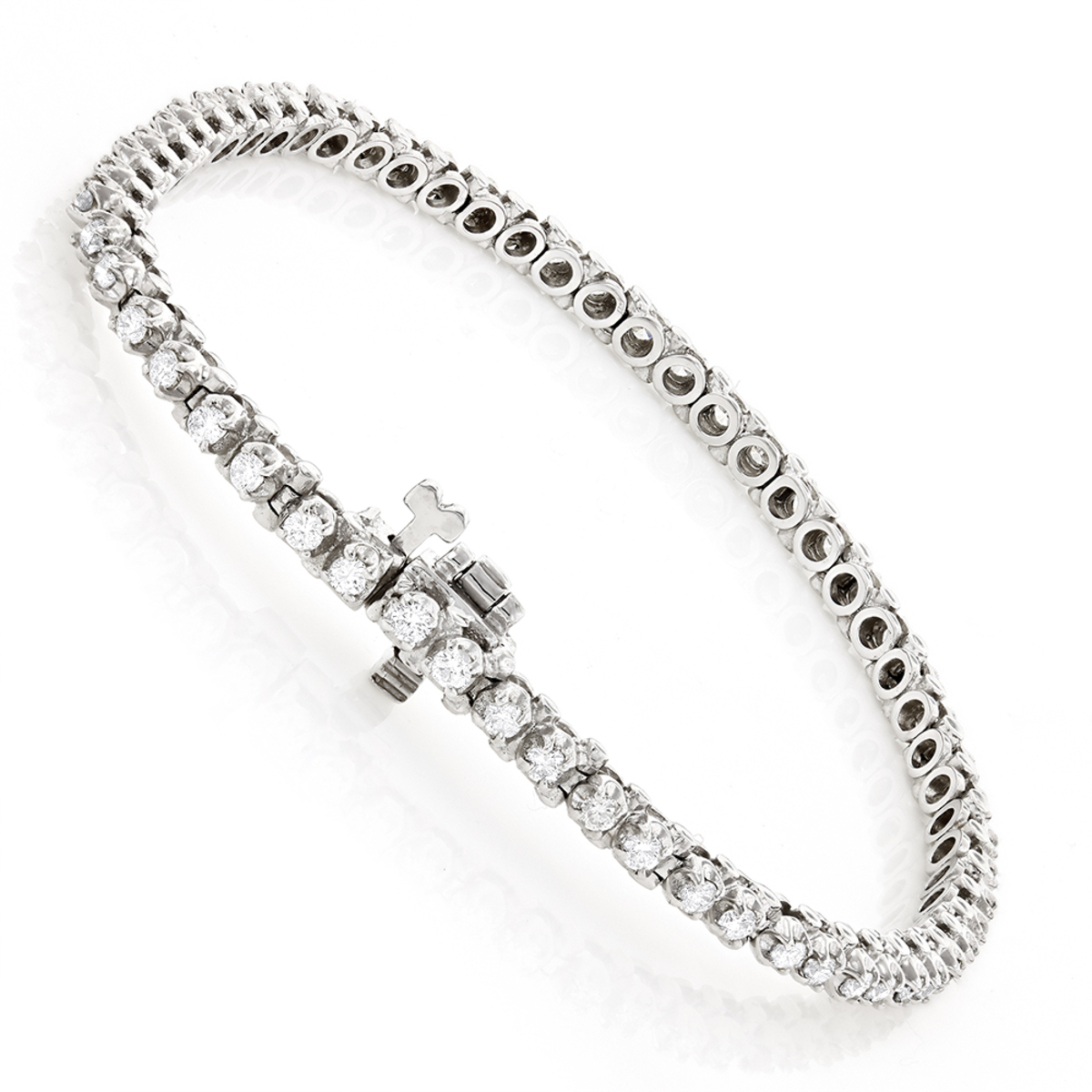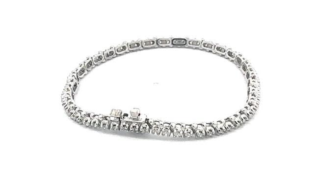 This Women's Diamond Tennis bracelet is made from 14k Gold, weighing 11 grams and is 3 mm wide and length inches. This Women's Diamond bracelet features 1.75 carats of White Diamonds, showcasing a chain and is available in 14k white gold, yellow gold and rose gold as well as 18k gold and platinum as a custom order.