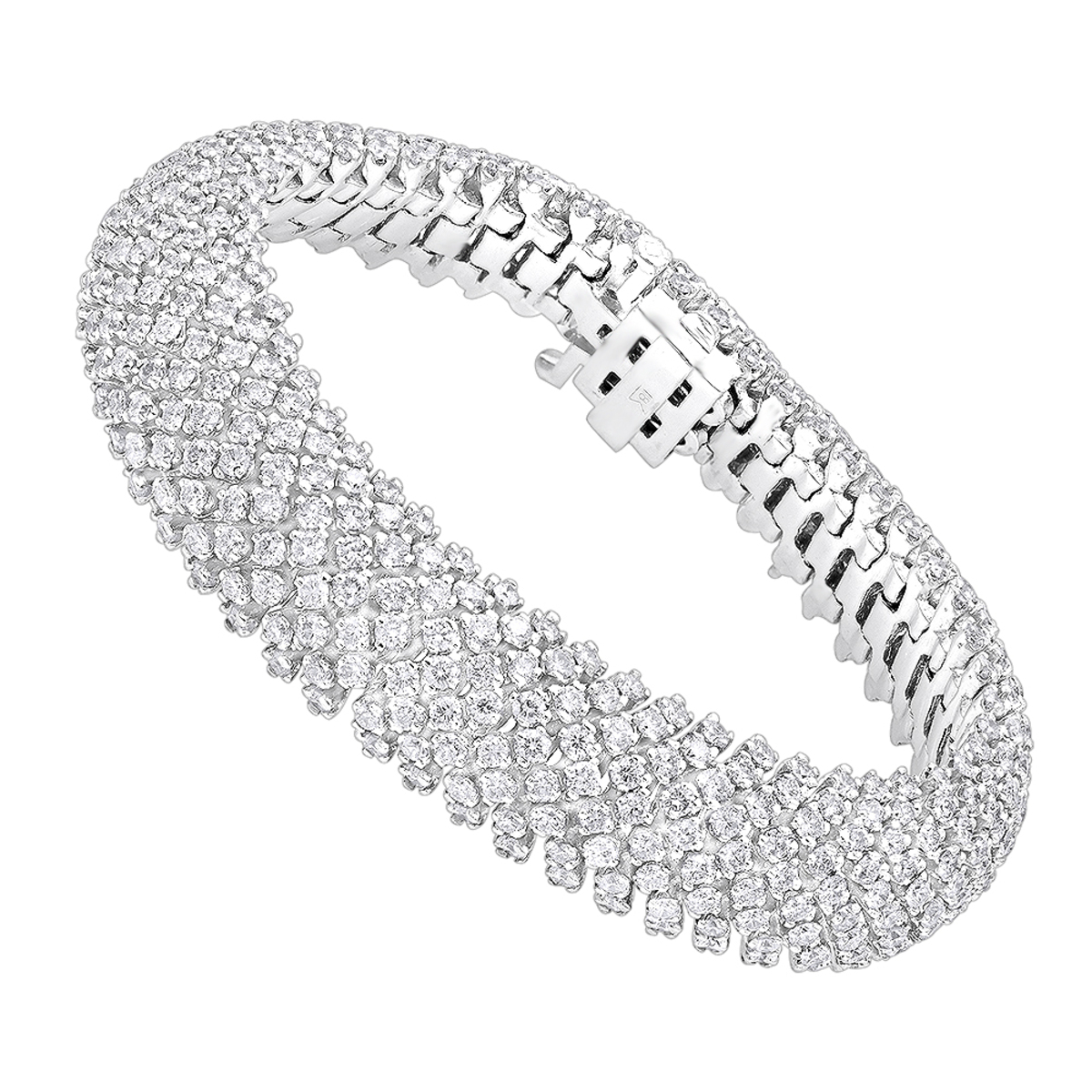 This Women's Diamond bracelet is made from 18k Gold, weighing 70.8 grams and is 15 mm wide and length inches. This Women's Diamond bracelet features 14.6 carats of White Diamonds, showcasing a chain and is available in 18k white gold, yellow gold and rose gold as well as 18k gold and platinum as a custom order.