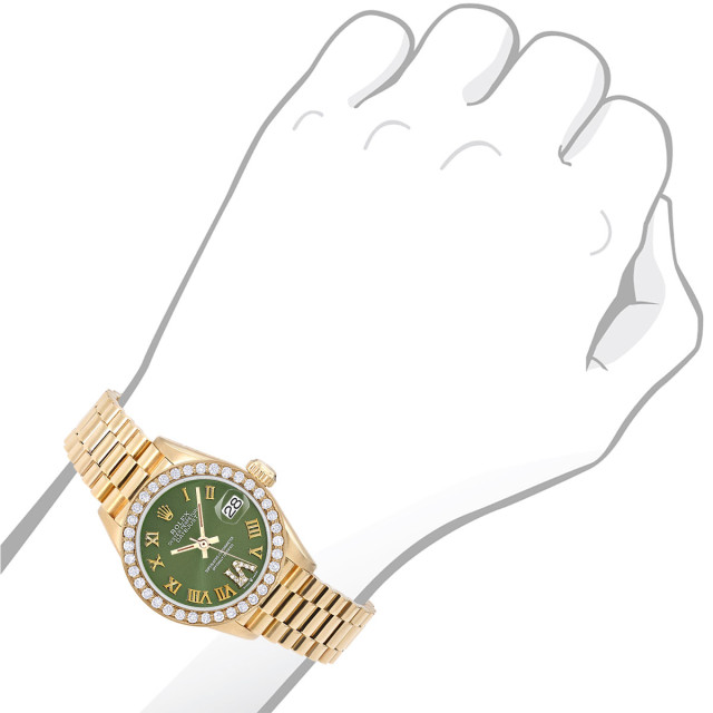 This Women's Rolex Datejust is a luxurious and stylish watch. It features a Yellow color scheme, adding sophistication to its design. The watch is made of 18k Gold, offering a premium feel. The case measures 26 mm. The case is crafted from 18k Gold. The bracelet is made of Yellow Gold It features a President style bracelet for a comfortable fit. The bezel is made of Yellow Gold and is set with Diamonds. The dial is Green, enhancing its visual appeal. Powered by an Automatic movement. Offered in Very Good condition, and comes with a seller's warranty of 60 months. Also available on custom order with additional options. These pre-owned Rolex watches are authentic Rolex watches with genuine diamonds, in excellent condition, they are checked for authenticity and basic water resistance. Watches will withstand an occasional rain just fine, but they are not diver's watches and should not be worn in shower or while swimming.