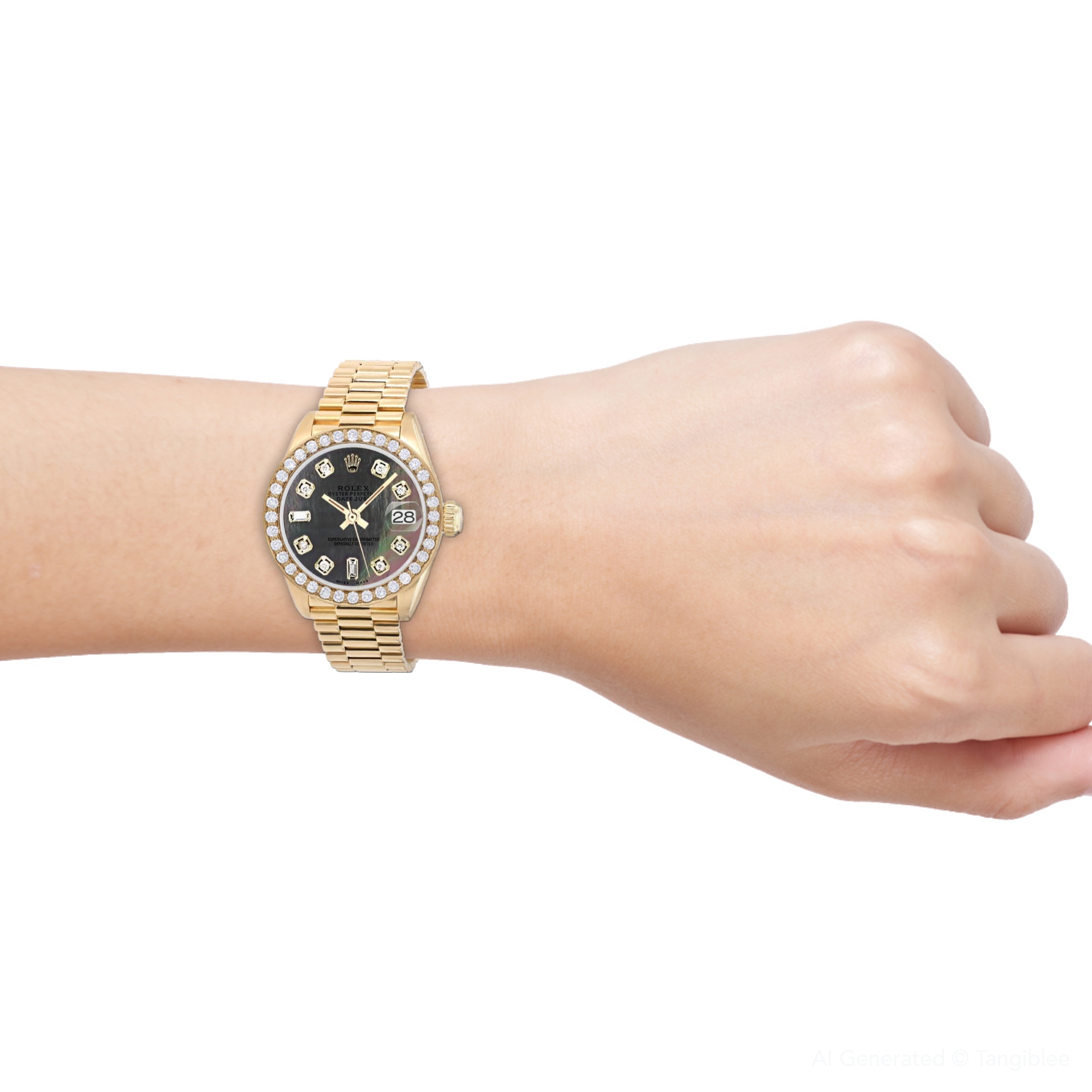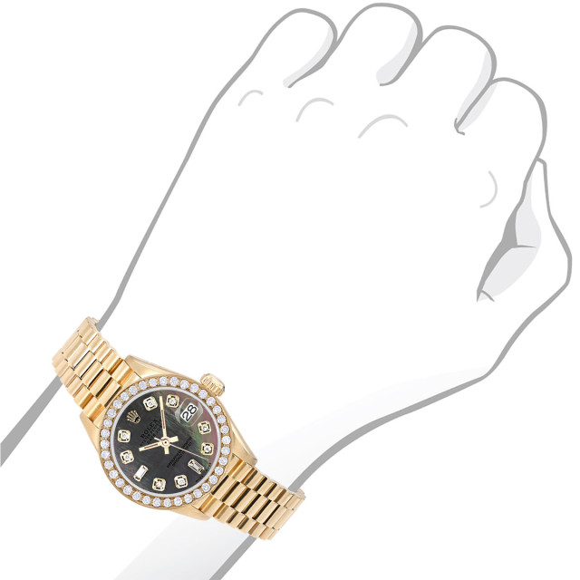 This Women's Rolex Datejust is a luxurious and stylish watch. It features a Yellow color scheme, adding sophistication to its design. The watch is made of 18k Gold, offering a premium feel. The case measures 26 mm. The case is crafted from 18k Gold. The bracelet is made of Yellow Gold It features a President style bracelet for a comfortable fit. The bezel is made of Yellow Gold and is set with Diamonds. The dial is Black, enhancing its visual appeal. Powered by an Automatic movement. Offered in Very Good condition, and comes with a seller's warranty of 60 months. Also available on custom order with additional options. These pre-owned Rolex watches are authentic Rolex watches with genuine diamonds, in excellent condition, they are checked for authenticity and basic water resistance. Watches will withstand an occasional rain just fine, but they are not diver's watches and should not be worn in shower or while swimming.