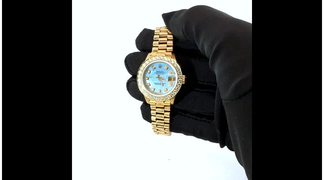 This Women's Rolex Datejust is a luxurious and stylish watch. It features a Yellow color scheme, adding sophistication to its design. The watch is made of 18k Gold, offering a premium feel. The case measures 26 mm. The case is crafted from 18k Gold. The bracelet is made of Yellow Gold It features a President style bracelet for a comfortable fit. The bezel is made of Yellow and is set with White Diamonds. The dial is Blue, enhancing its visual appeal. Powered by an Automatic movement. Offered in Good condition, and comes with a seller's warranty of 60 months. Also available on custom order with additional options. These pre-owned Rolex watches are authentic Rolex watches with genuine diamonds, in excellent condition, they are checked for authenticity and basic water resistance. Watches will withstand an occasional rain just fine, but they are not diver's watches and should not be worn in shower or while swimming.